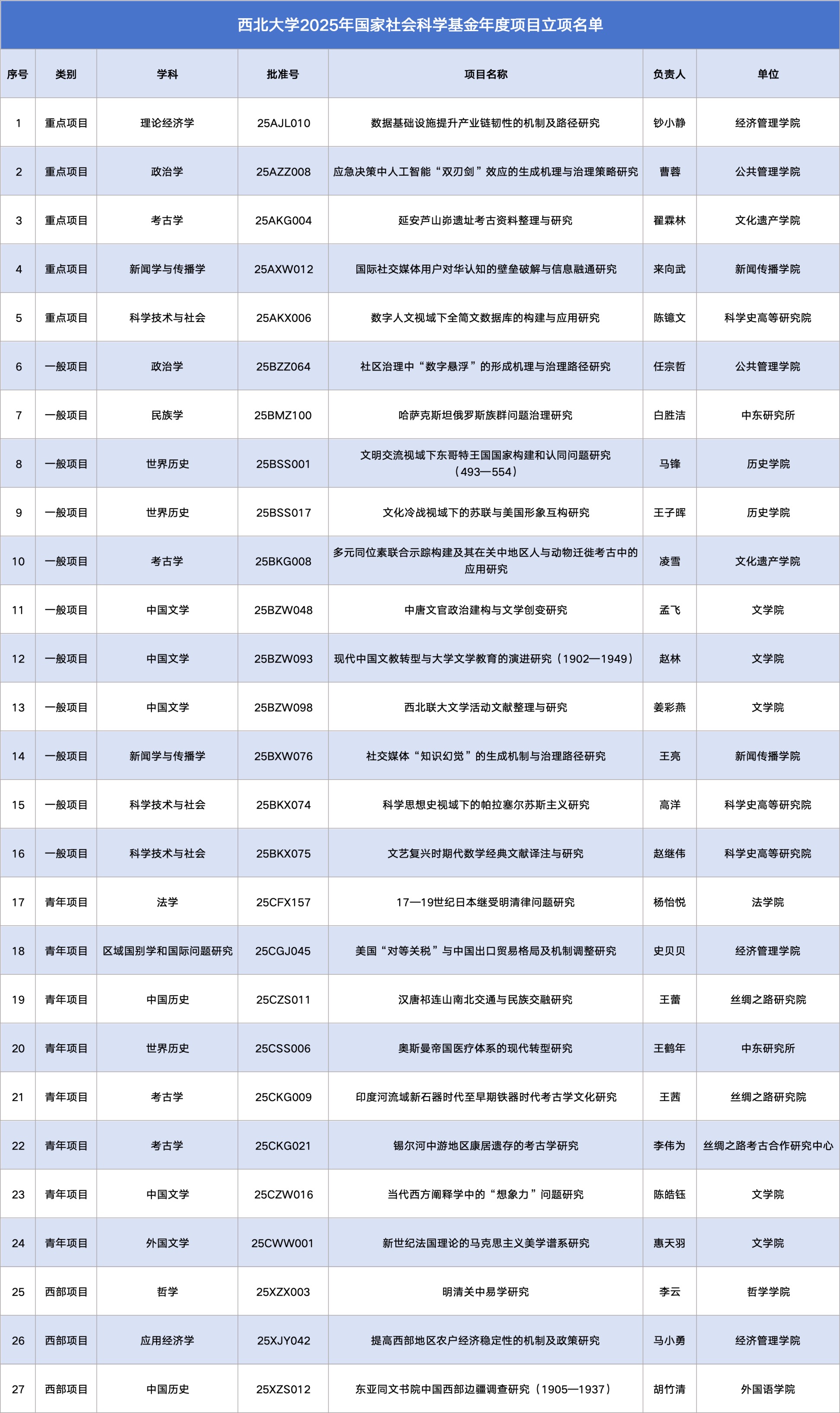 日前,全国哲学社会科学工作办公室公布了2025年国家社会科学基金年度项目立项结果,8868体育登录获批2025年国家社会科学基金年度项目27项(重点项目5项、一般项目11项、青年项目8项、西部项目3项),其中重点项目立项呈上升态势,重点项目立项数位列全国并列第4,中国文学、考古学项目保持良好发展态势。