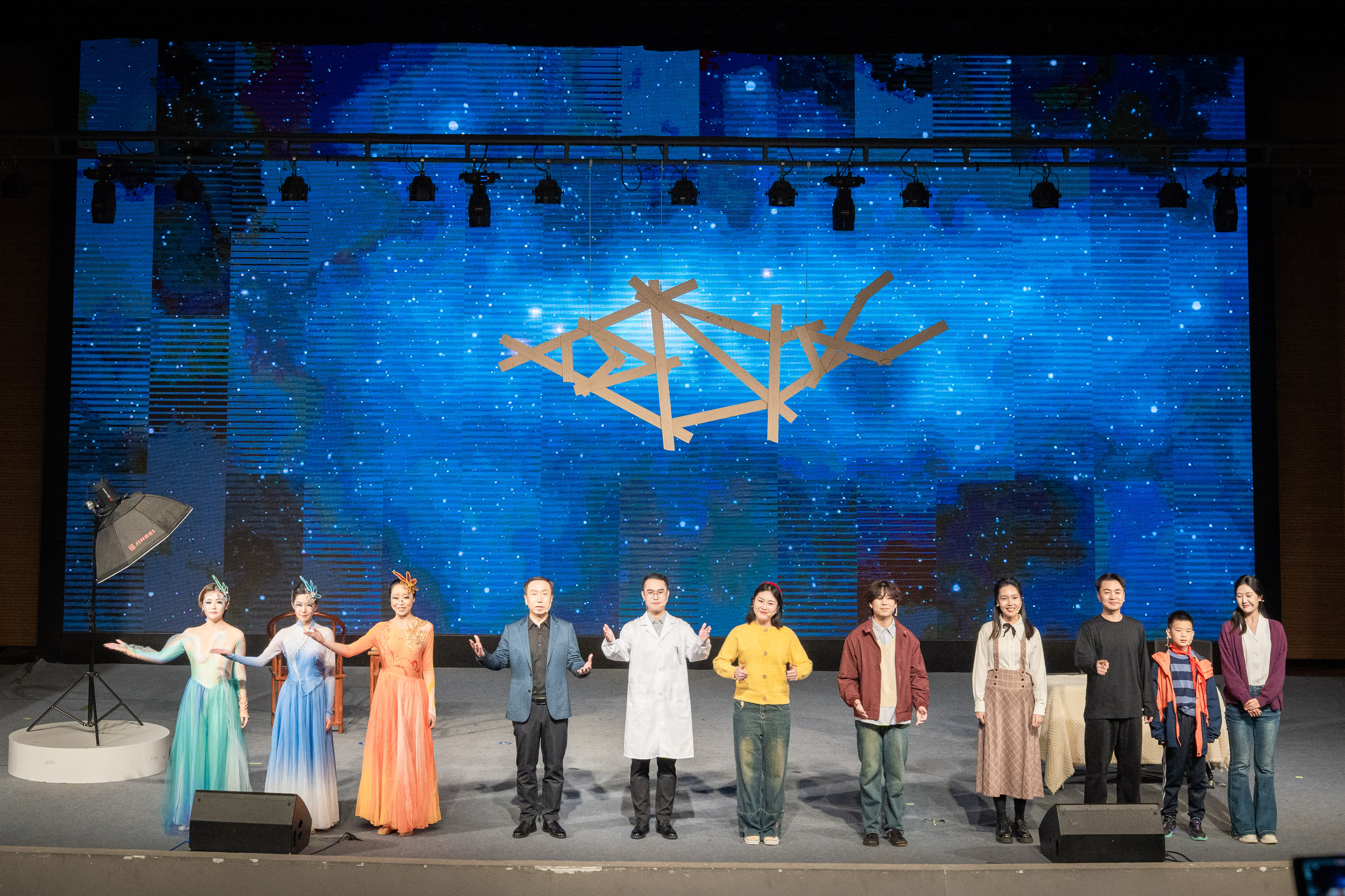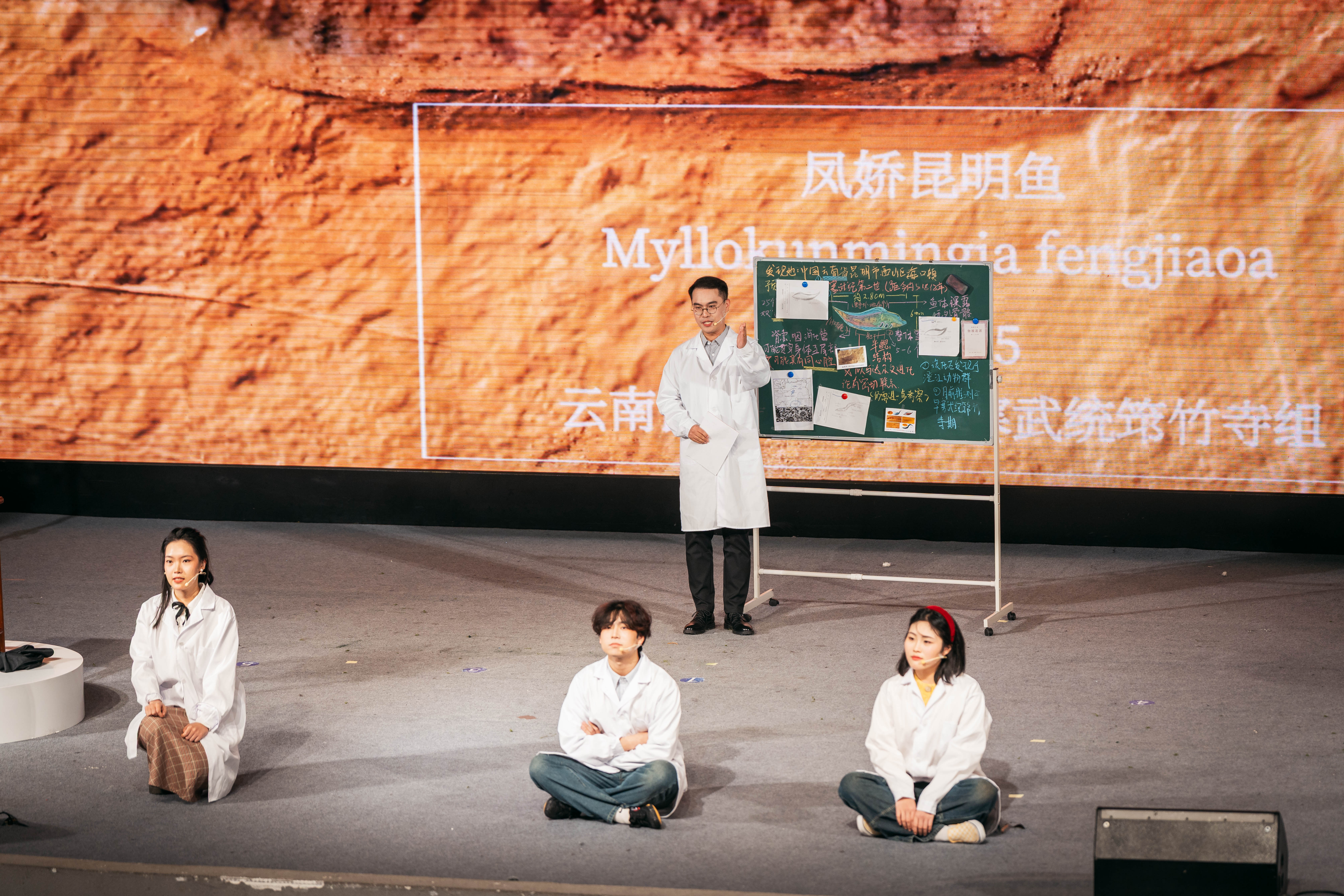 由8868体育登录文学院与地质学系联合出品、文学院师生倾情排演的原创科普剧《天下第一鱼畅想曲》,以戏剧艺术的形式,将科学故事搬上舞台,实现了“硬核”科研与“浪漫”人文的碰撞。该剧以舒德干院士及其团队发现已知最早的脊椎动物化石——“凤姣昆明鱼”的故事为原型,通过戏剧化叙事和象征性舞台表现,再现科学家“探秘寒武纪”的科研旅程。剧中,少年舒德干对鱼类世界充满好奇,在母亲“凤姣”的鼓励下踏上了科学探索之路。时光交错间,舞台切换至1999年的实验室。舒德干与三位学生围绕一块来自云南的化石展开研究,通过对肌节、鳃囊、心脏、脊索等结构的严谨分析,确认这是一条寒武纪鱼类化石——后命名为“凤姣昆明鱼”。“凤姣”,正是舒德干母亲的名字——他用此命名表达“母亲孕育生命、科学孕育真理”的寓意。舞台上,演员们用富有诗意的对白诠释科研的严谨,展现了科学家从少年好奇到终身探索的精神蜕变。“舒院士用自己母亲的名字为昆明鱼命名,将‘母亲’的生物学意义与情感意义交融,所蕴含的诗意与情怀让我印象深刻。”西大附中八年级二班学生经悦然说。据了解,该剧目前已获得2025年科学家故事舞台剧推广行动剧目培育专项资助。为打造这部科普剧,创作团队多次走访地质学系实验室,邀请专家学者讲解专业知识,前后多次修改剧本10余稿,力求在科学性与艺术性之间找到最佳平衡。