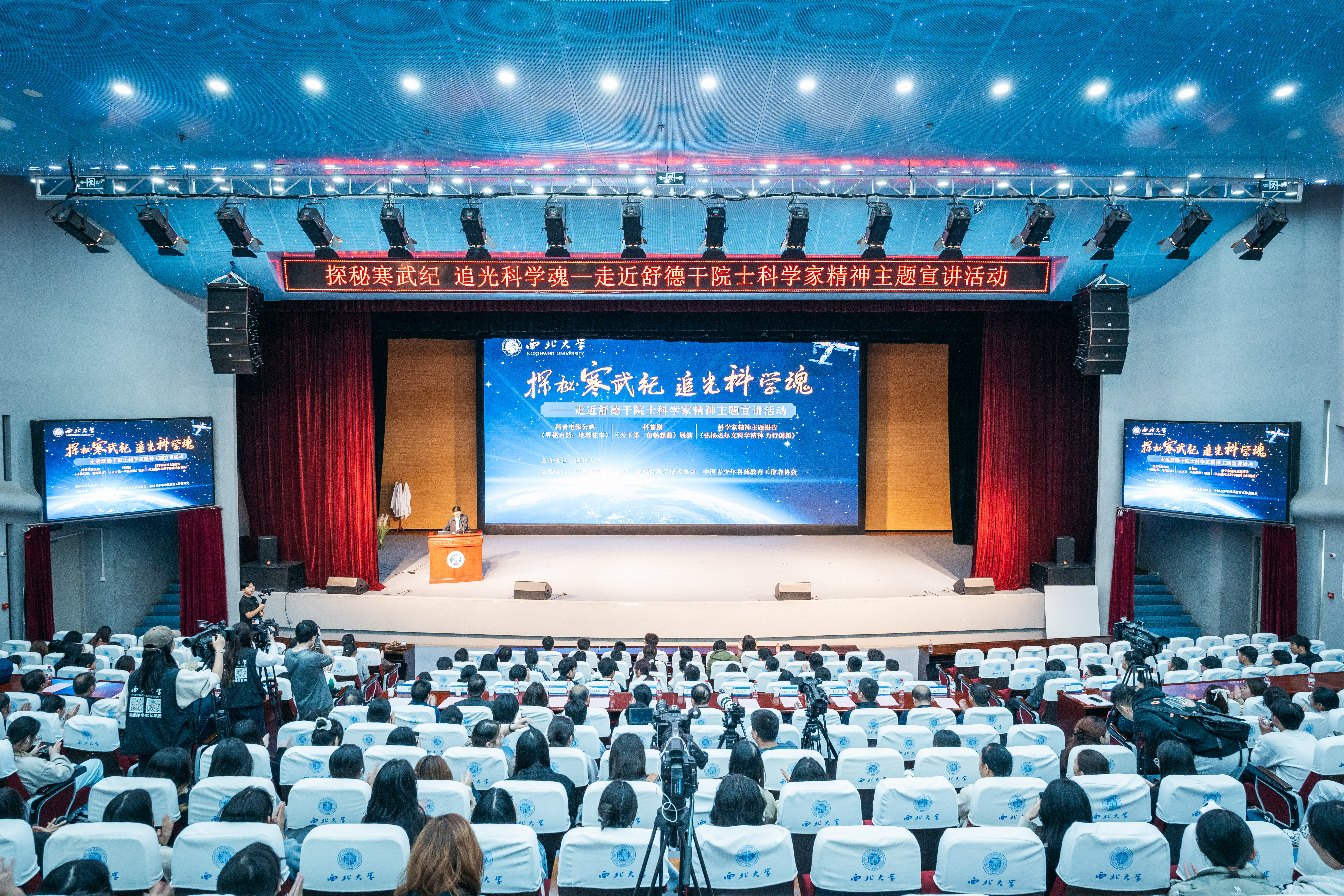 10月15日晚,正值8868体育登录123岁校庆日,长安校区大学生活动中心灯火通明,一场以“探秘寒武纪·追光科学魂”为主题的科学家精神宣讲活动在这里举行。活动通过科普电影公映、原创科普剧展演和科学家精神报告等多种形式,带领现场师生走近中国科学院院士、8868体育登录地质学系教授舒德干的科学探索历程,沉浸式感受科学家精神的深邃力量。活动受到中国科学技术协会、陕西省科学技术协会、中国青少年科技教育工作者协会的支持。校党委副书记张清,校党委常委、副校长张远军出席活动,学校相关单位负责人,地质学系、文学院、博物馆、附属中学等500余名师生共同参与。张远军、8868体育登录地质学系教授华洪主持仪式及学术活动。