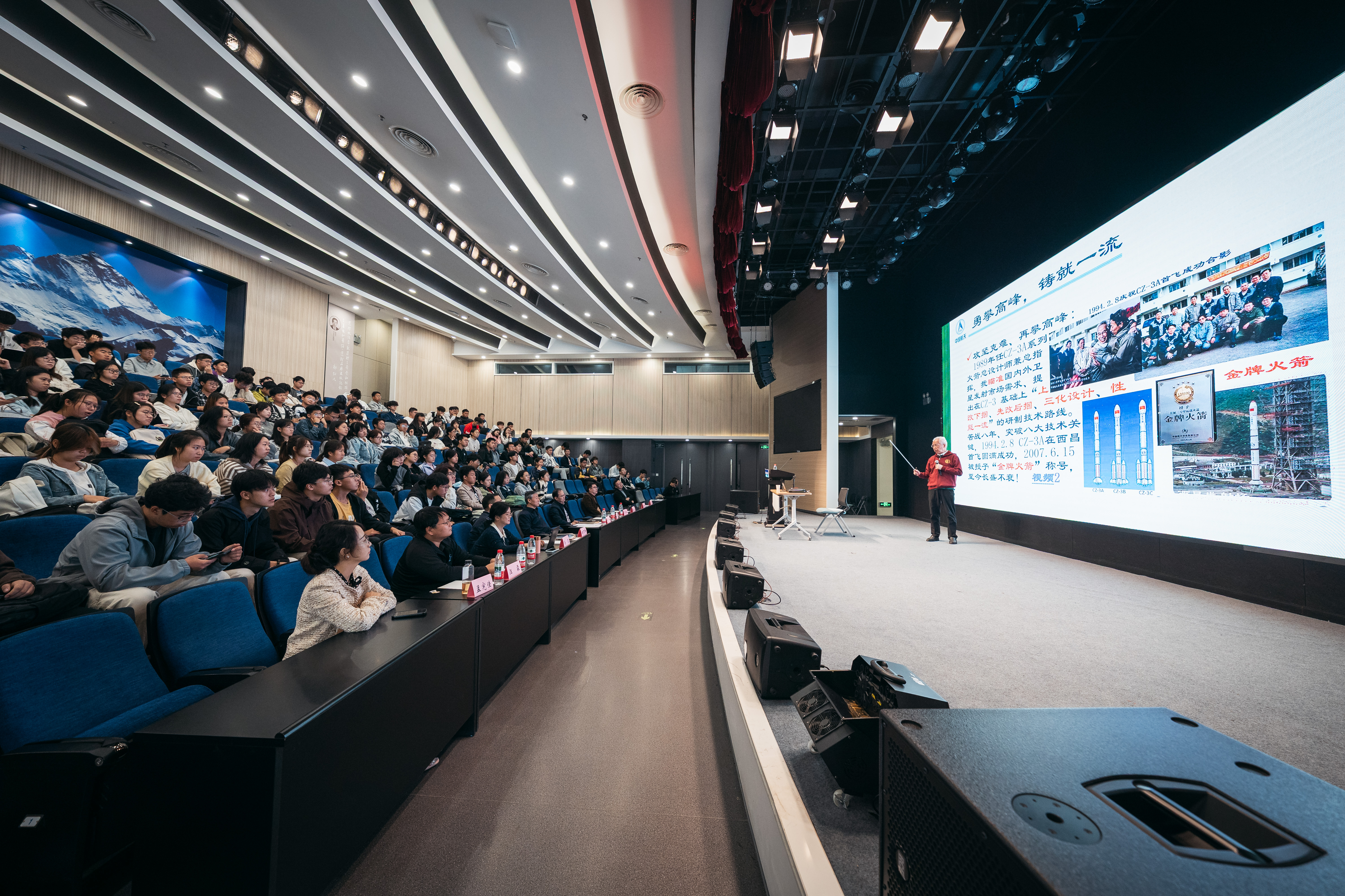 报告中,龙乐豪院士回溯了自己的成长历程。他坦言,年少时历经战乱,目睹国家积弱,“让祖国拥有强大国防”的念头便在心中扎根。谈及航天生涯的关键节点,龙乐豪院士重点分享了1996年西昌长征三号乙运载火箭发射失利的经历。他回忆,失利后面对国内外的质疑与压力,自己曾夜不能寐,一夜白头,但航天报国的初心从未动摇。在他的带领下,团队摒弃杂念,扎根实验室,逐帧复盘数据,逐项排查故障,最终精准定位问题并完成技术改进,实现了从失利到成功的关键跨越。报告中,他多次勉励在场同学:“新时代给了你们更好的科研条件,要珍惜机遇、树立远大理想,既要锤炼坚韧品格,更要敢于在科学探索中迎难而上。”报告最后,龙乐豪院士向师生们分享了自己的人生感悟,他指出,成功靠勤奋,成功与失败都是财富;青春不分年龄,要时刻保持“归来依旧是少年”的豪情;知识改变命运,人生路遥远,唯步履不息,一生向阳。