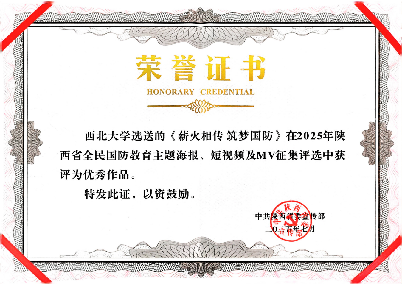 近日,由中共陕西省委宣传部组织的“2025年陕西省全民国防教育主题海报、短视频及MV征集评选”结果揭晓,8868体育登录选送的作品《薪火相传筑梦国防》获评“优秀作品”。