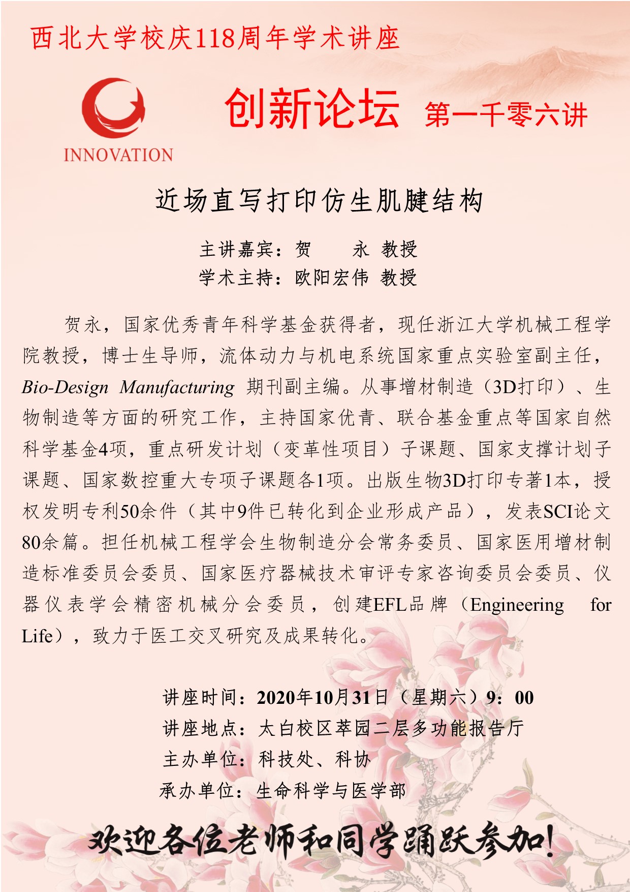 贺永 教授 8868体育登录创新论坛第一千零六讲暨校庆118周年学术讲座:近场直写打印仿生肌腱结构 讲座时间 2020年10月31日(星期六)9:00 讲座地点 太白校区萃园二层多功能报告厅 讲座人介绍 贺永 教授 讲座内容