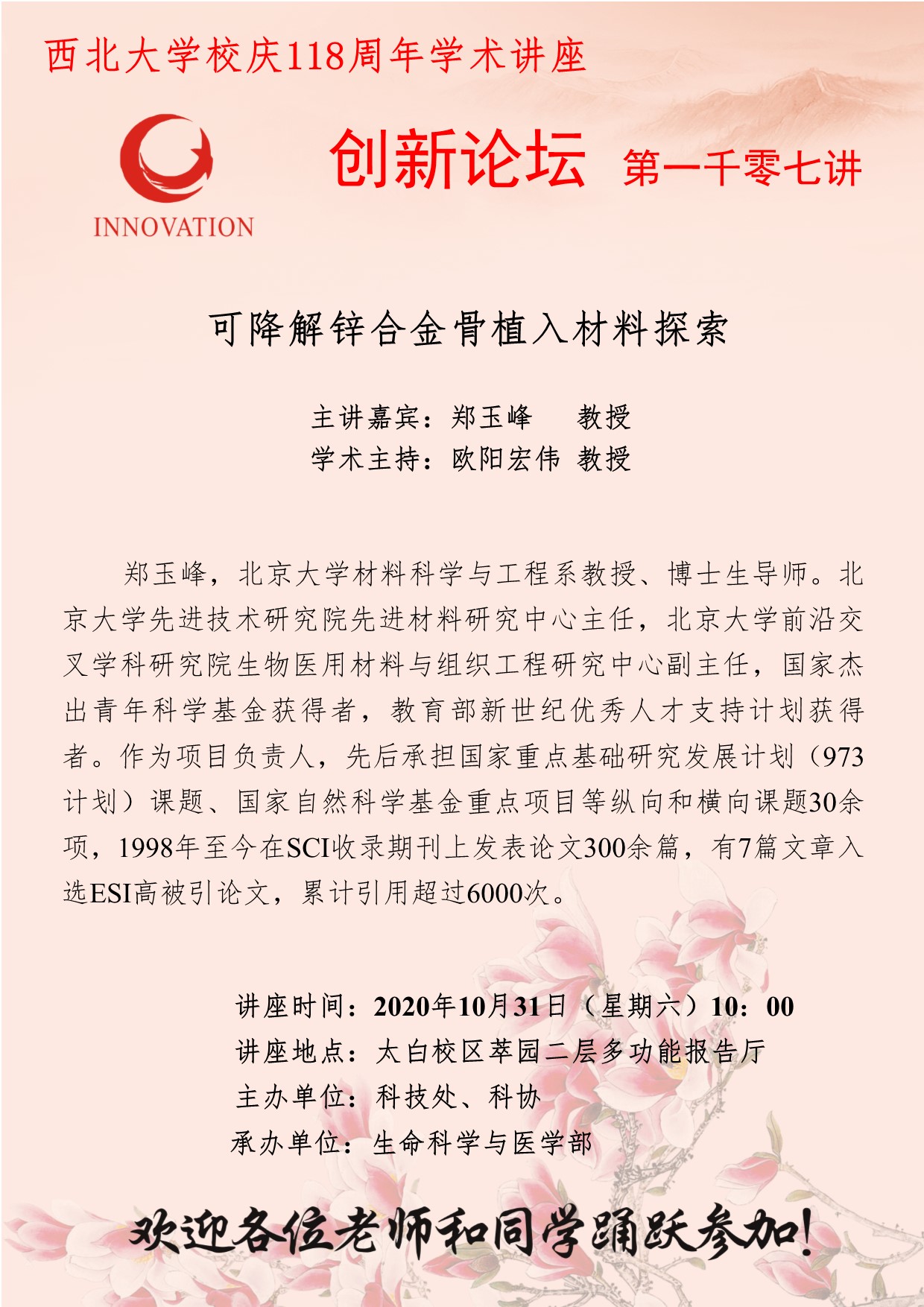 郑玉峰 教授 8868体育登录创新论坛第一千零七讲暨校庆118周年学术讲座:可降解锌合金骨植入材料探索 讲座时间 2020年10月31日(星期六)10:00 讲座地点 太白校区萃园二层多功能报告厅 讲座人介绍 郑玉峰 教授 讲座内容