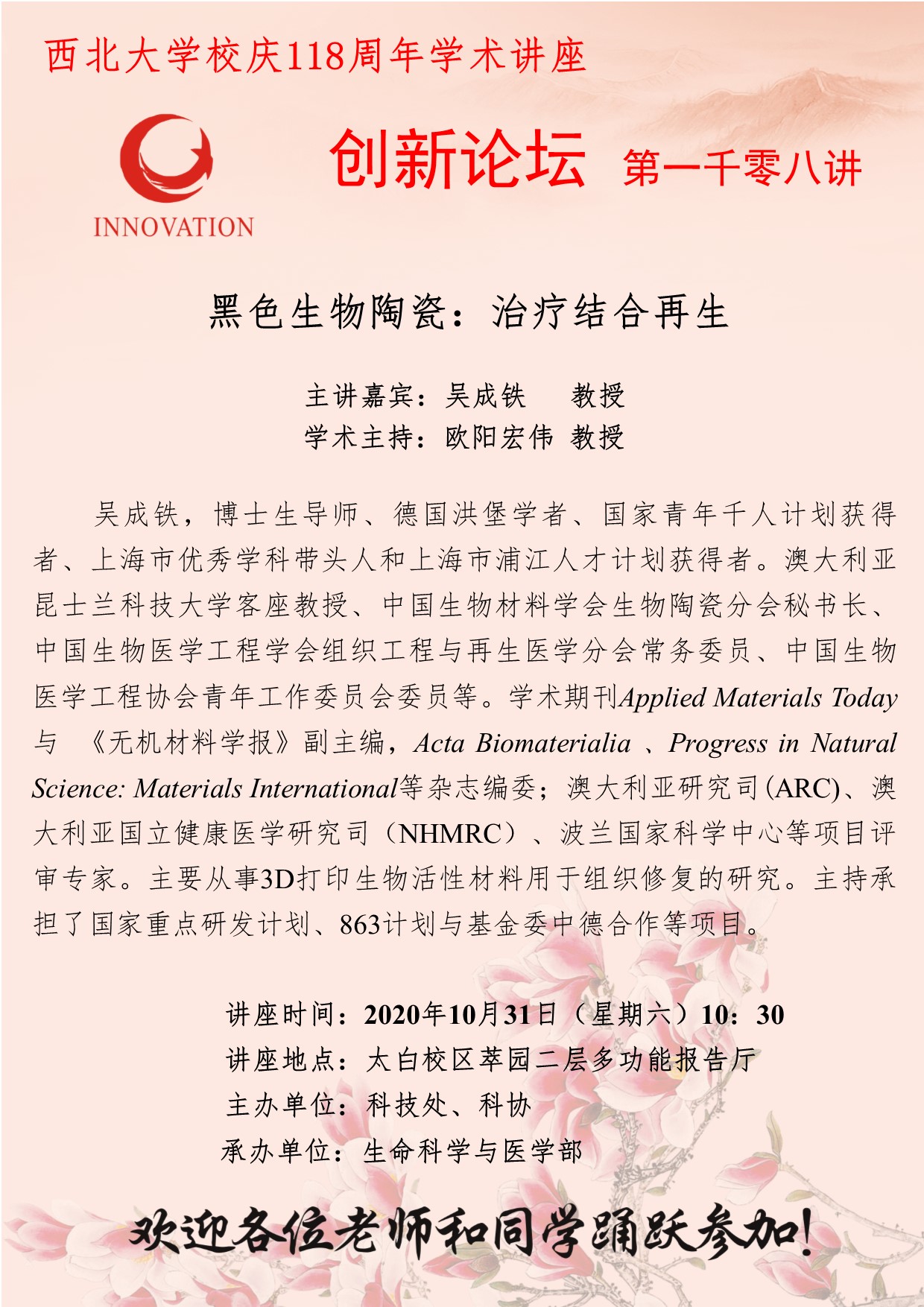吴成铁 教授 8868体育登录创新论坛第一千零八讲暨校庆118周年学术讲座:黑色生物陶瓷:治疗结合再生 讲座时间 2020年10月31日(星期六)10:30 讲座地点 太白校区萃园二层多功能报告厅 讲座人介绍 吴成铁 教授 讲座内容
