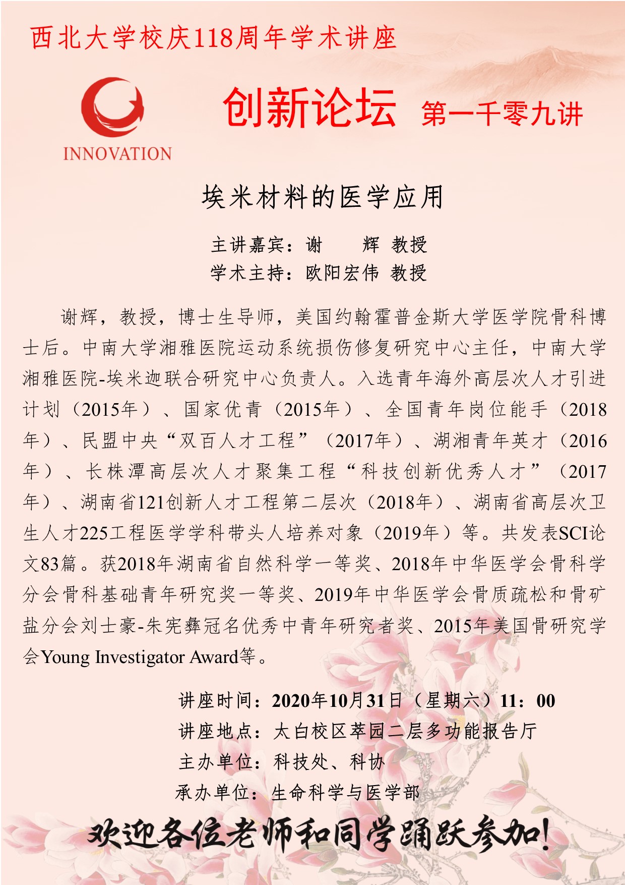 谢辉 教授 8868体育登录创新论坛第一千零九讲暨校庆118周年学术讲座:埃米材料的医学应用 讲座时间 2020年10月31日(星期六)11:00 讲座地点 太白校区萃园二层多功能报告厅 讲座人介绍 谢辉 教授 讲座内容