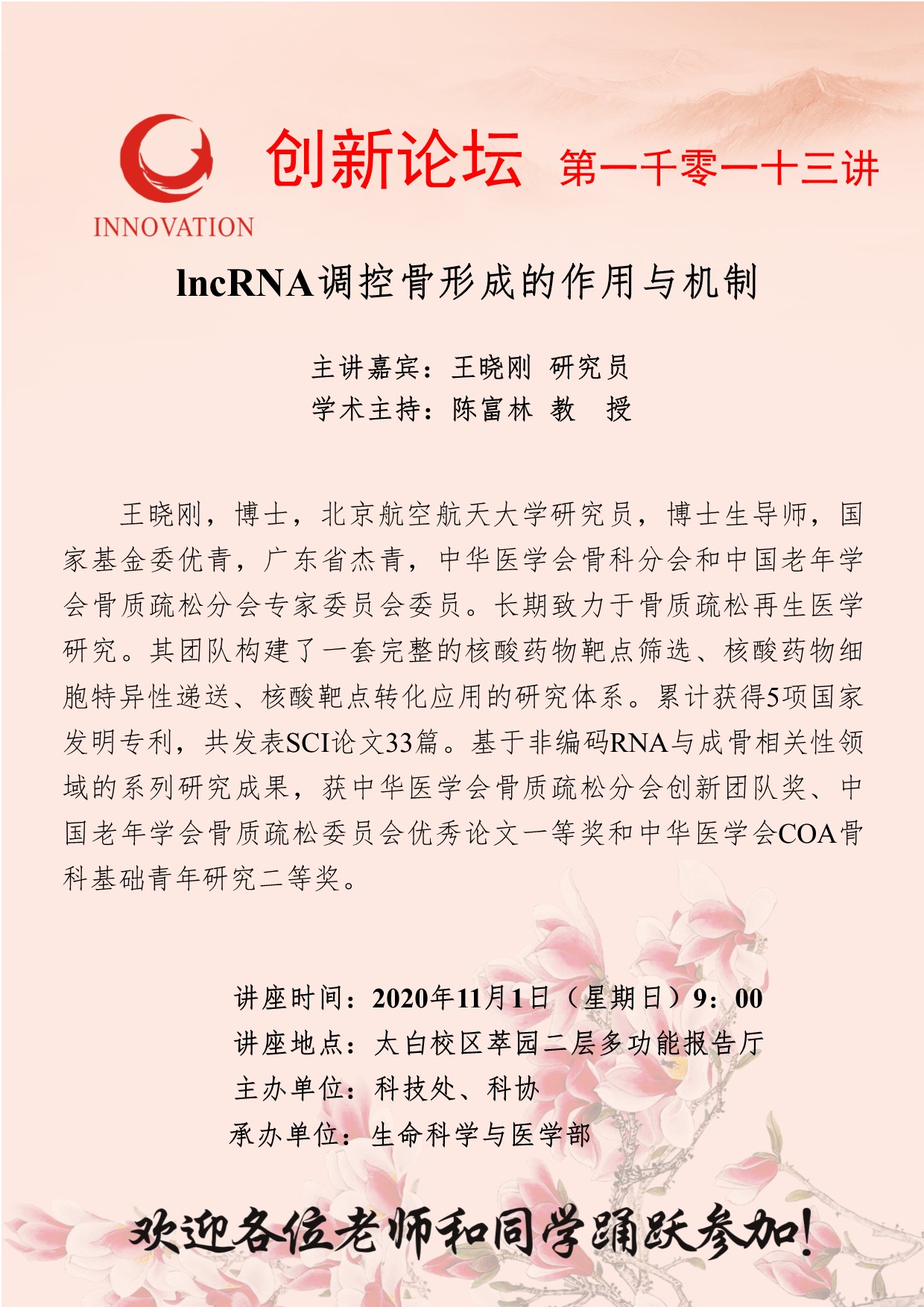 王晓刚 研究员 8868体育登录创新论坛第一千零一十三讲:lncRNA调控骨形成的作用与机制 讲座时间 2020年11月1日(星期日)9:00 讲座地点 太白校区萃园二层多功能报告厅 讲座人介绍 王晓刚 研究员 讲座内容