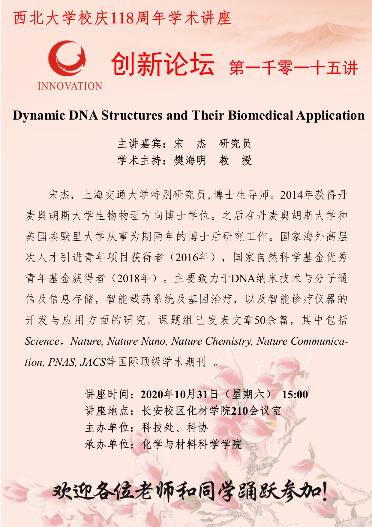 宋杰 研究员 8868体育登录创新论坛第一千零一十五讲暨校庆118周年学术讲座:Dynamic DNA Structures and Their Biomedical Application 讲座时间 2020年10月31日(星期六)15:00 讲座地点 化学与材料科学学院210室 讲座人介绍 宋杰 研究员 讲座内容