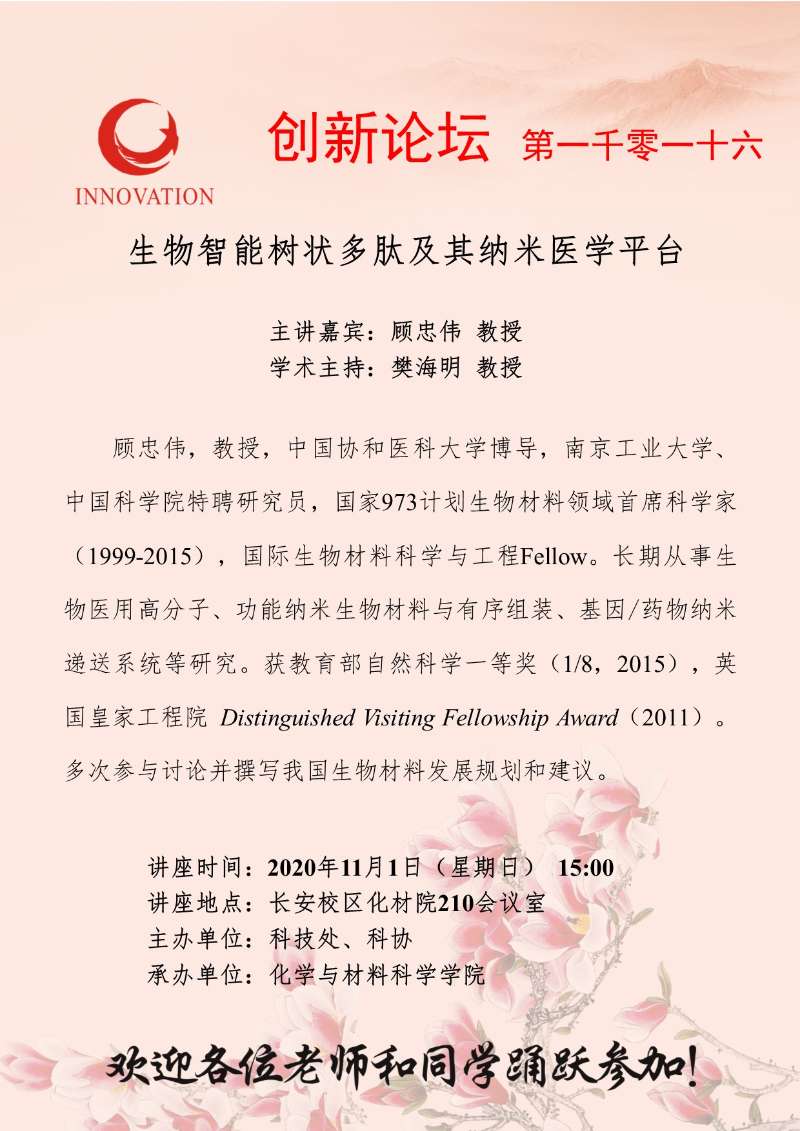 顾忠伟 教授 8868体育登录创新论坛第一千零一十六讲:生物智能树状多肽及其纳米医学平台 讲座时间 2020年11月1日(星期日) 15:00 讲座地点 长安校区化材院210会议室 讲座人介绍 顾忠伟 教授 讲座内容