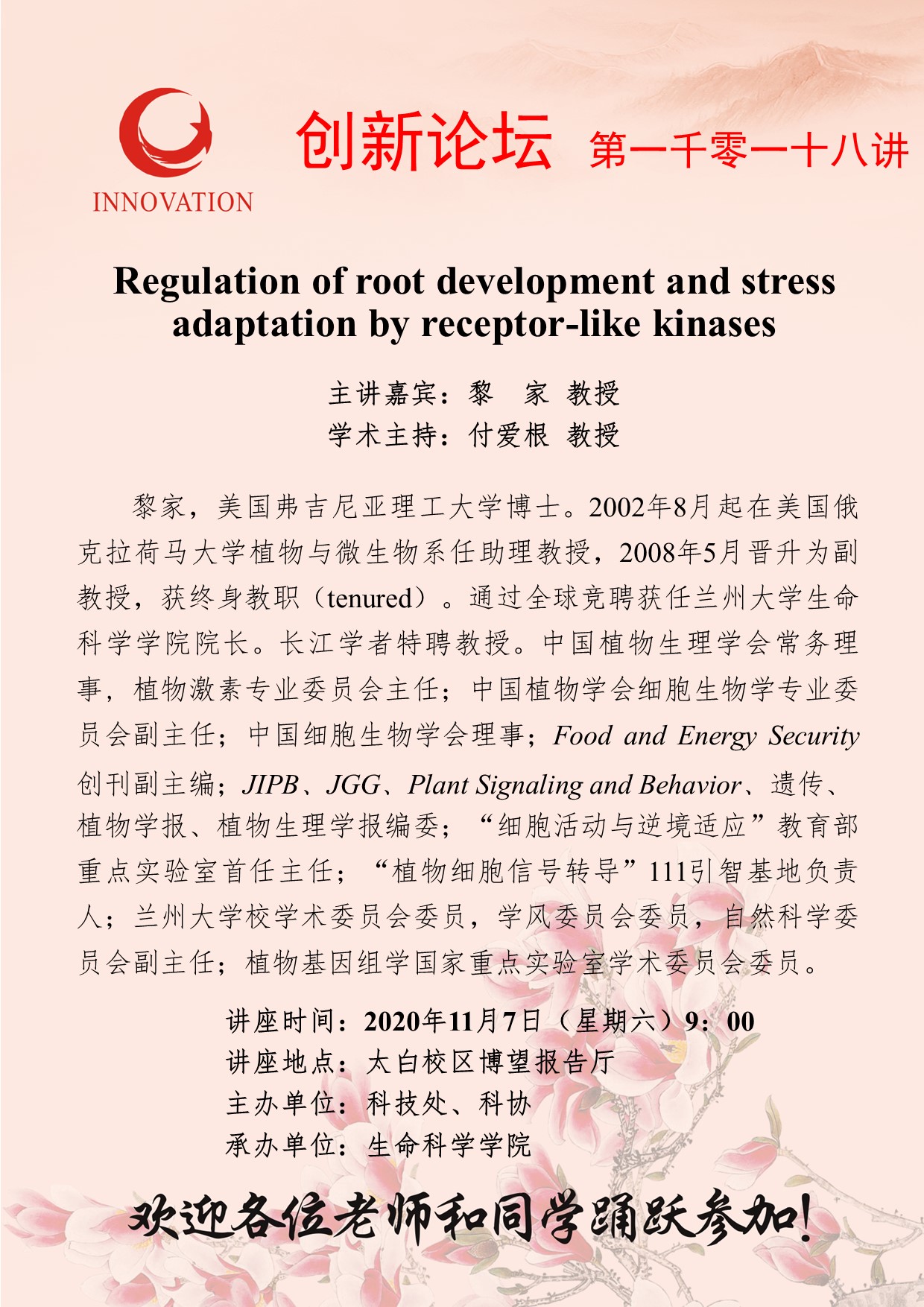 黎 家 教授 8868体育登录创新论坛第一千零一十八讲:Regulation of root development and stress adaptation by receptor-like kinases 讲座时间 2020年11月7日(星期六)9:00 讲座地点 太白校区博望报告厅 讲座人介绍 黎 家 教授 讲座内容