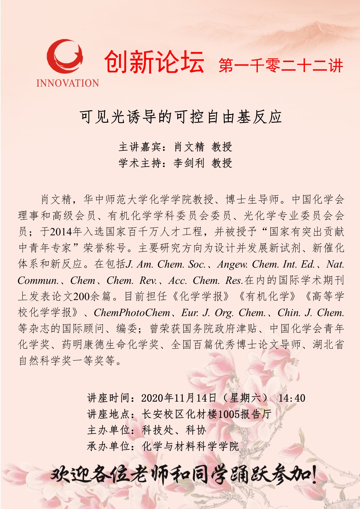 肖文精 教授 8868体育登录创新论坛第一千零二十二讲:可见光诱导的可控自由基反应 讲座时间 2020年11月14日(周六)14:40 讲座地点 长安校区化材楼1005报告厅 讲座人介绍 肖文精 教授 讲座内容