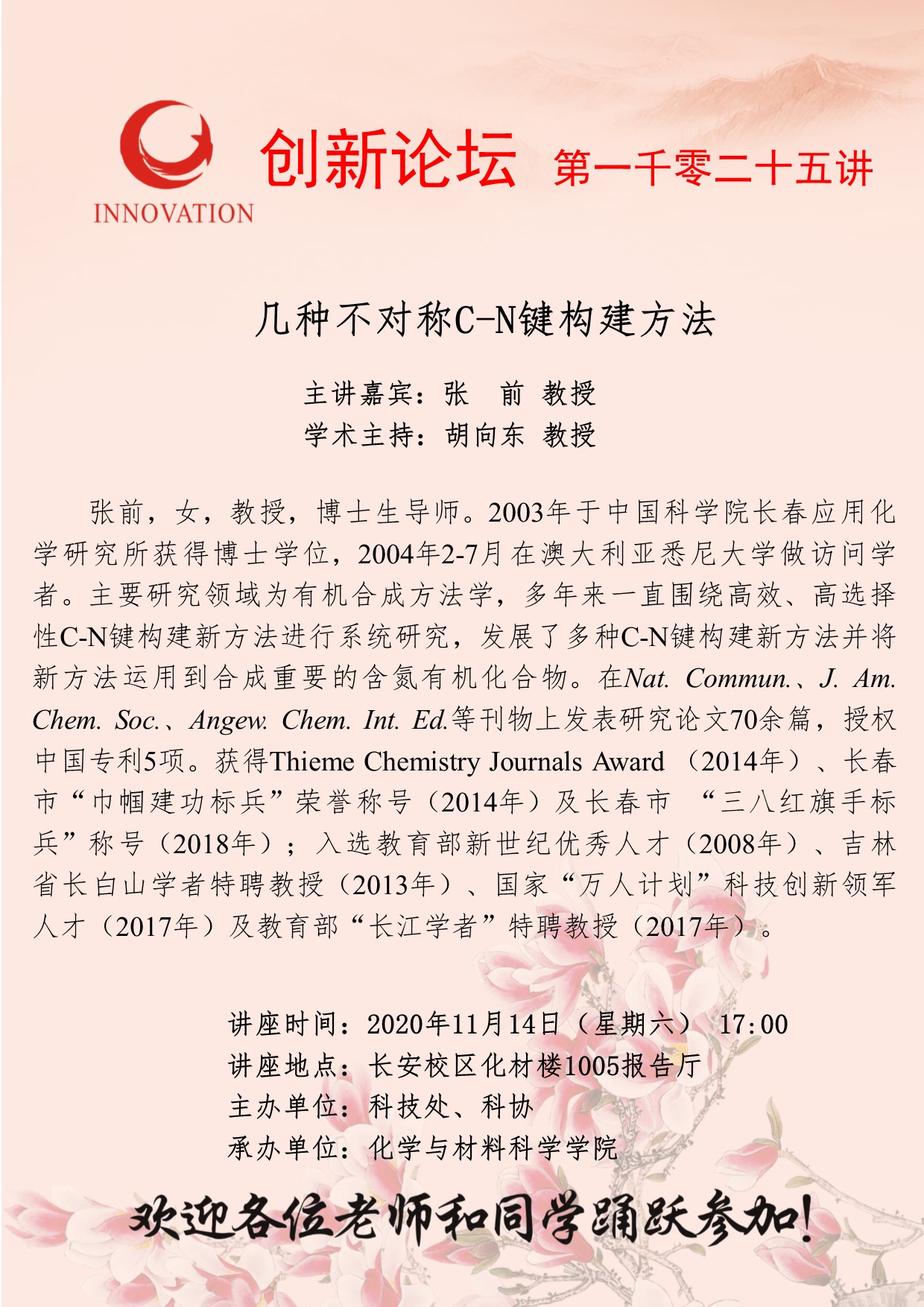 张前 教授 8868体育登录创新论坛第一千零二十五讲:几种不对称C-N键构建方法 讲座时间 2020年11月14日(周六)17:00 讲座地点 长安校区化材楼1005报告厅 讲座人介绍 张前 教授 讲座内容