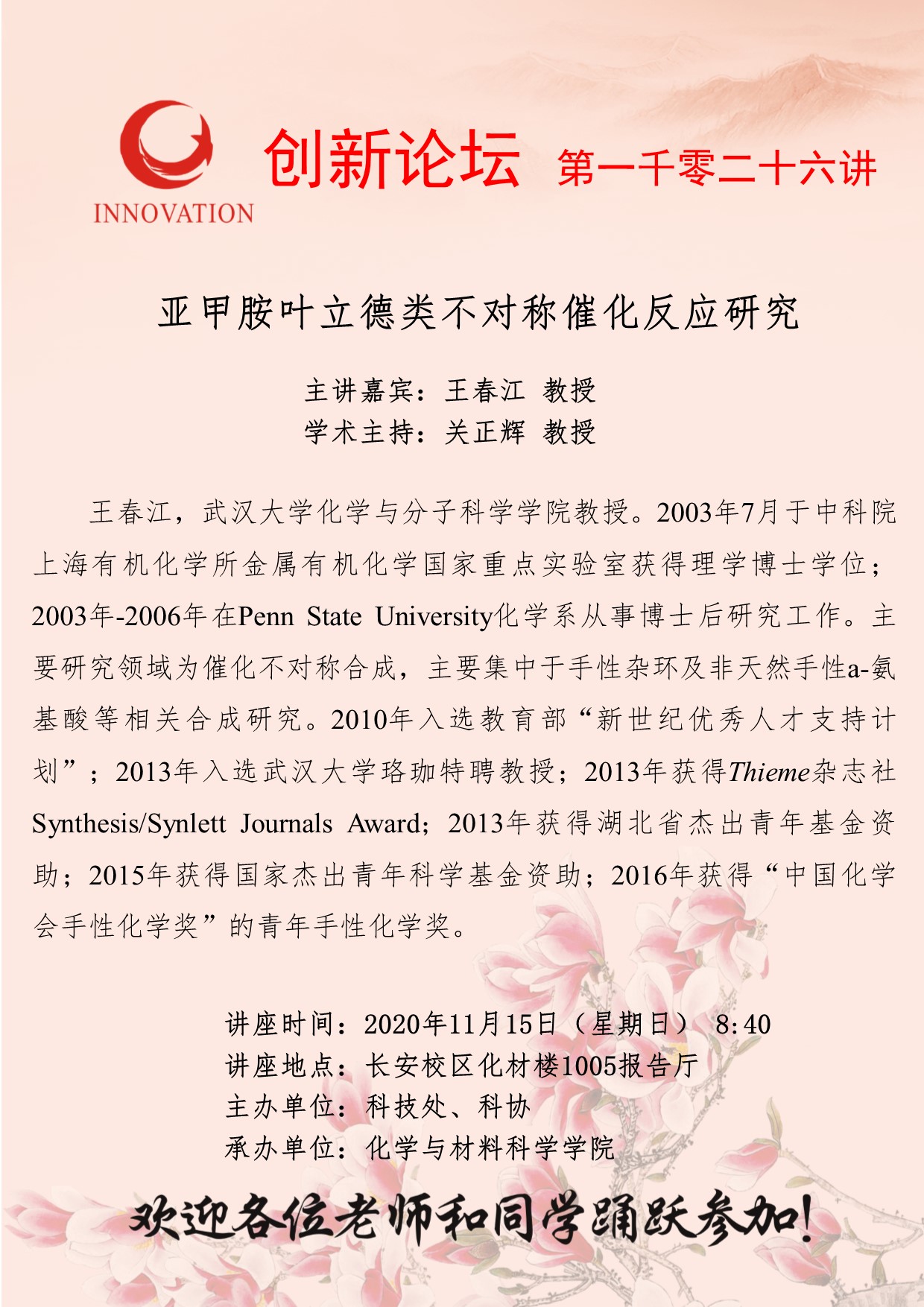 王春江 教授 8868体育登录创新论坛第一千零二十六讲:亚甲胺叶立德类不对称催化反应研究 讲座时间 2020年 11月15日(星期日)8:40 讲座地点 长安校区化材楼1005报告厅 讲座人介绍 王春江 教授 讲座内容
