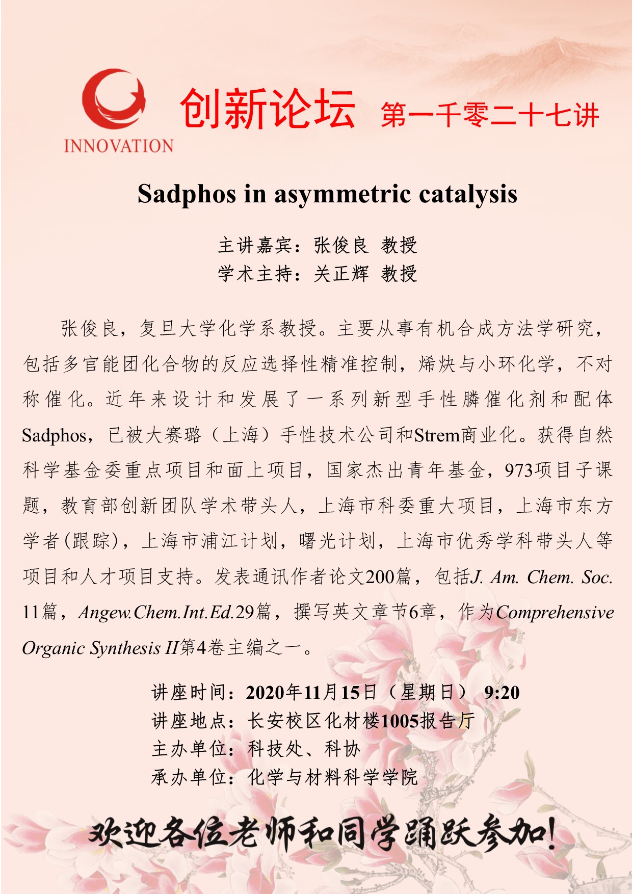 张俊良 教授 8868体育登录创新论坛第一千零二十七讲:Sadphos in asymmetric catalysis 讲座时间 2020年11月15日(星期日)9:20 讲座地点 长安校区化材楼1005报告厅 讲座人介绍 张俊良 教授 讲座内容