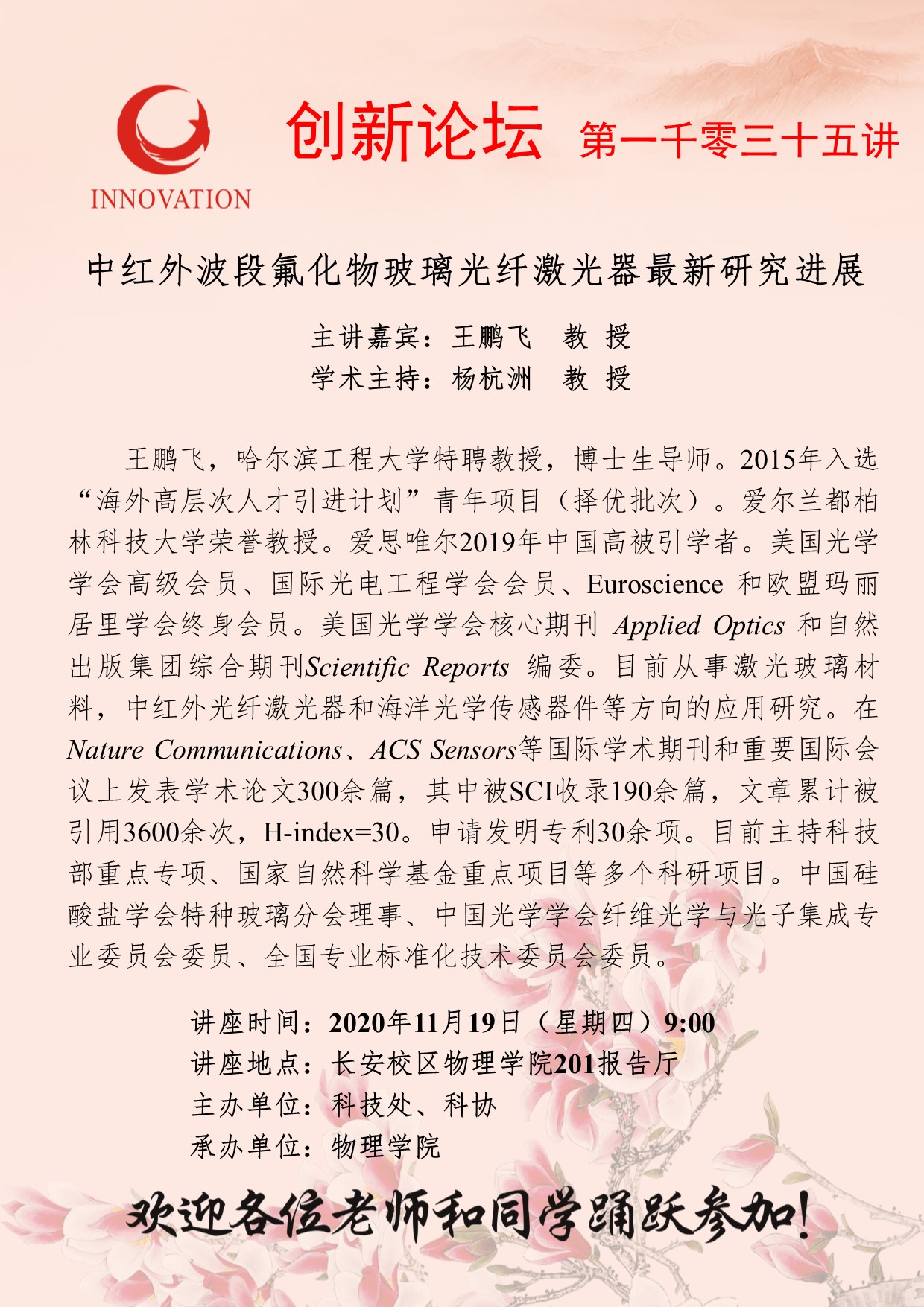 王鹏飞 教授 8868体育登录创新论坛第一千零三十五讲:中红外波段氟化物玻璃光纤激光器最新研究进展 讲座时间 2020年11月19日(星期四) 9:00 讲座地点 长安校区物理学院201报告厅 讲座人介绍 王鹏飞 教授 讲座内容