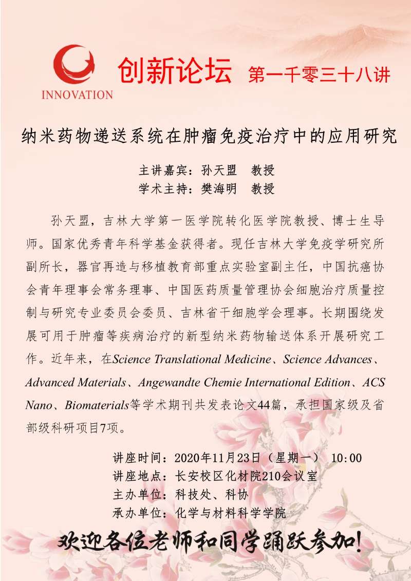 孙天盟 教授 8868体育登录创新论坛第一千零三十八讲:纳米药物递送系统在肿瘤免疫治疗中的应用研究 讲座时间 2020年11月23日(星期一) 10:00 讲座地点 长安校区化材院210会议室 讲座人介绍 孙天盟 教授 讲座内容