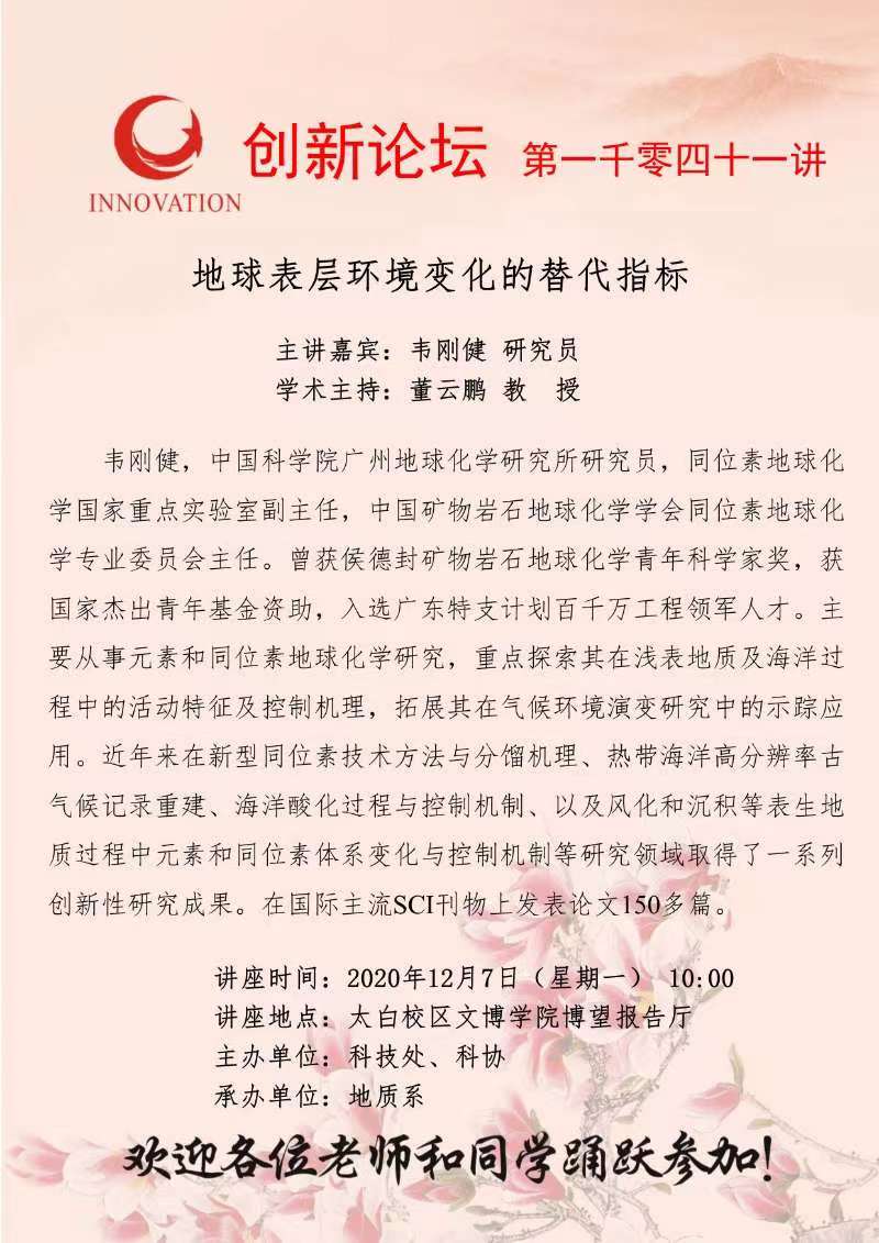韦刚健 研究员 8868体育登录创新论坛第一千零四十一讲:地球表层环境变化的替代指标 讲座时间 2020年12月7日(星期一) 10:00 讲座地点 太白校区文博学院博望报告厅 讲座人介绍 韦刚健 研究员 讲座内容