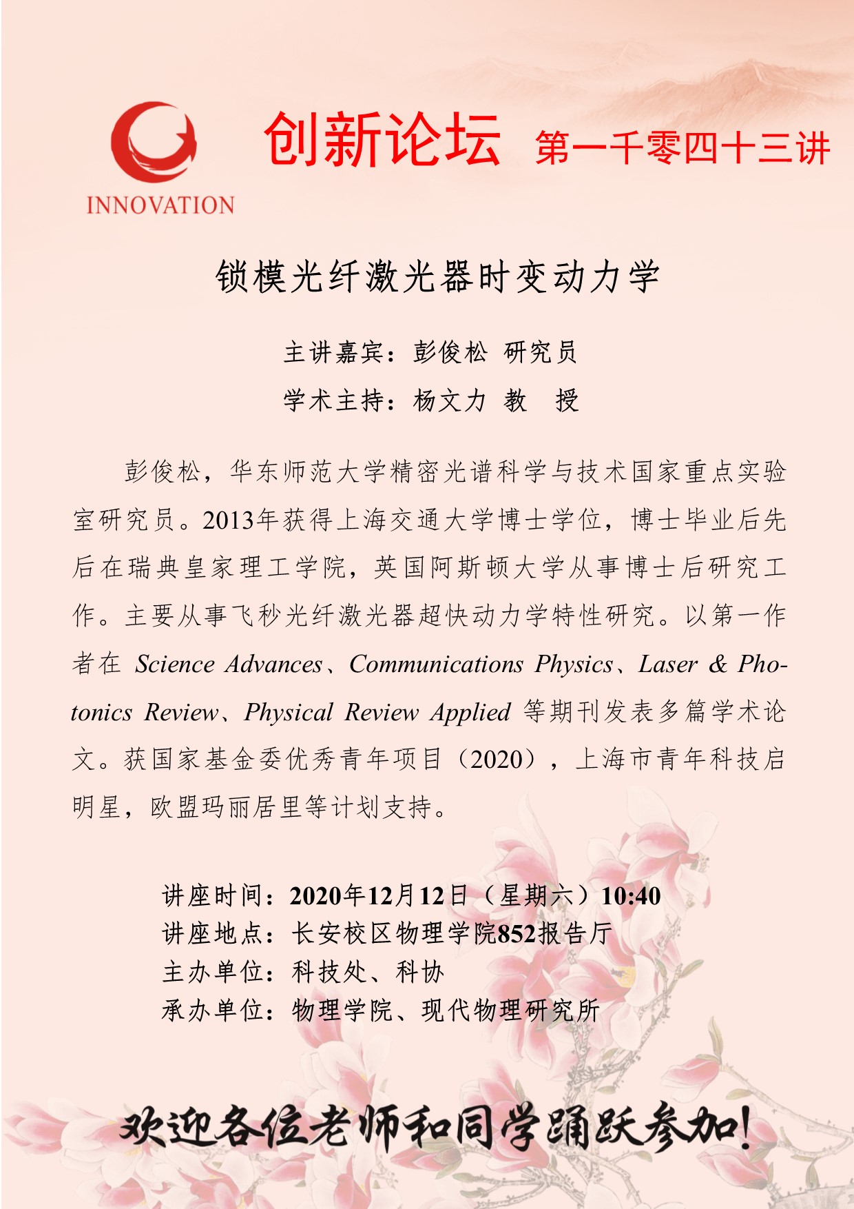 彭俊松 研究员 8868体育登录创新论坛第一千零四十三讲:锁模光纤激光器时变动力学 讲座时间 2020年12月12日(星期六)10:40 讲座地点 长安校区物理学院852报告厅 讲座人介绍 彭俊松 研究员 讲座内容
