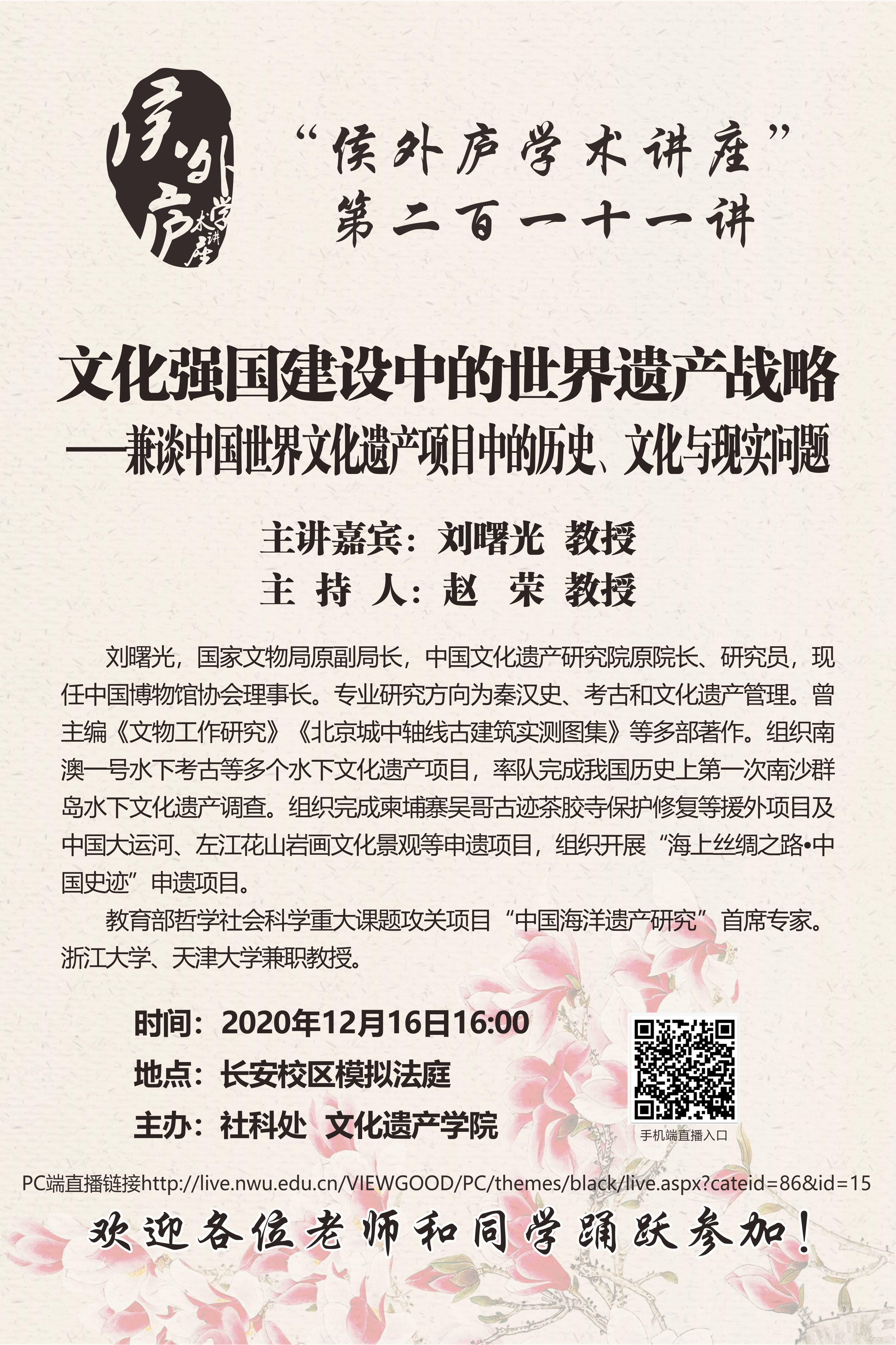侯外庐学术讲座第二百一十一讲:文化强国建设中的世界遗产战略——兼谈中国世界文化遗产项目中的历史、文化与现实问题