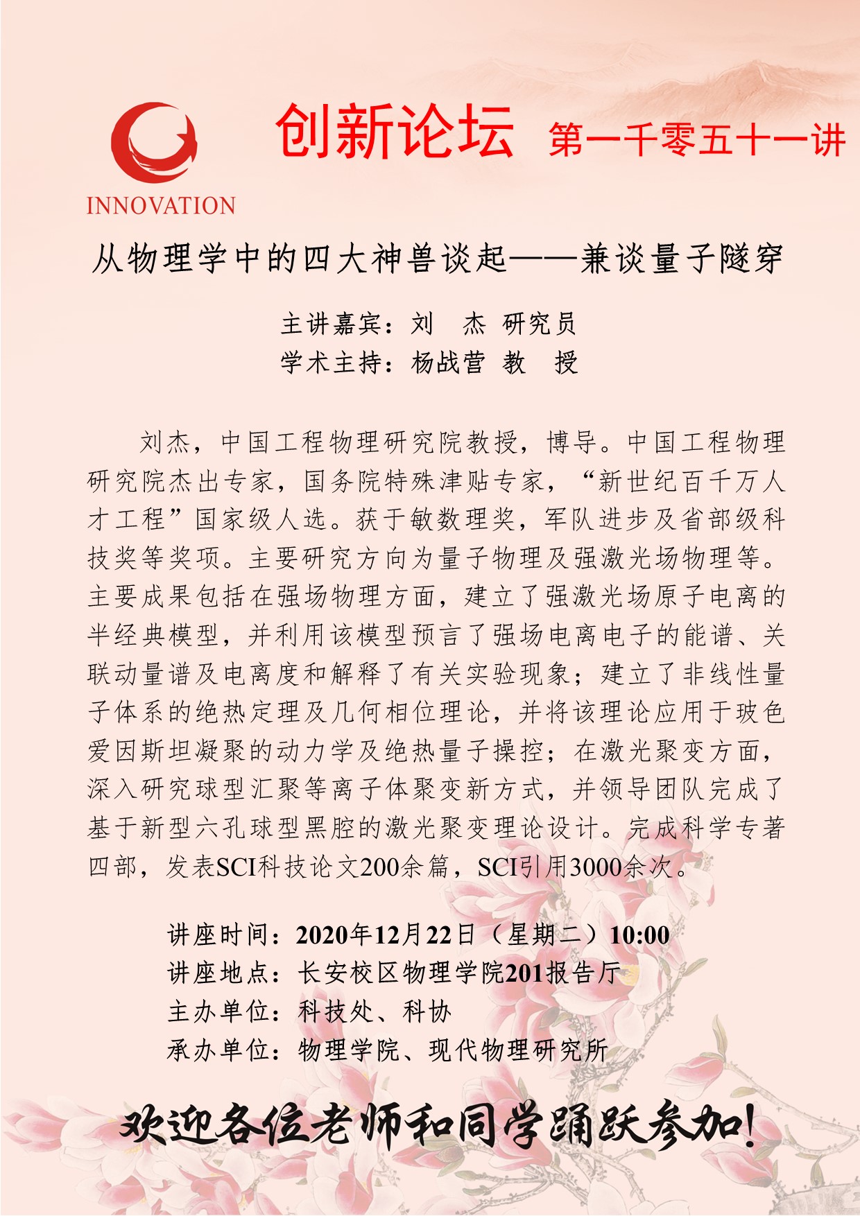 刘 杰 研究员 8868体育登录创新论坛第一千零五十一讲:从物理学中的四大神兽谈起——兼谈量子隧穿 讲座时间 2020年12月22日(星期二)10:00 讲座地点 长安校区物理学院201报告厅 讲座人介绍 刘 杰 研究员 讲座内容