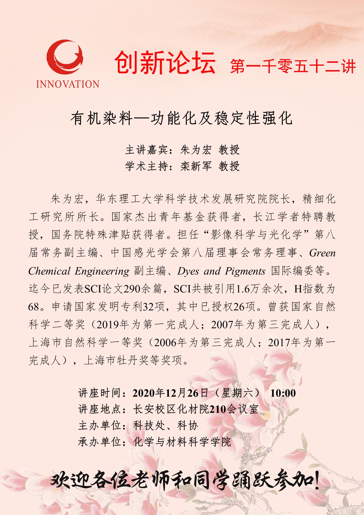 朱为宏 教授 8868体育登录创新论坛第一千零五十二讲: 有机染料—功能化及稳定性强化 讲座时间 2020年12月26日(星期六) 10:00 讲座地点 长安校区化材院210会议室 讲座人介绍 朱为宏 教授 讲座内容