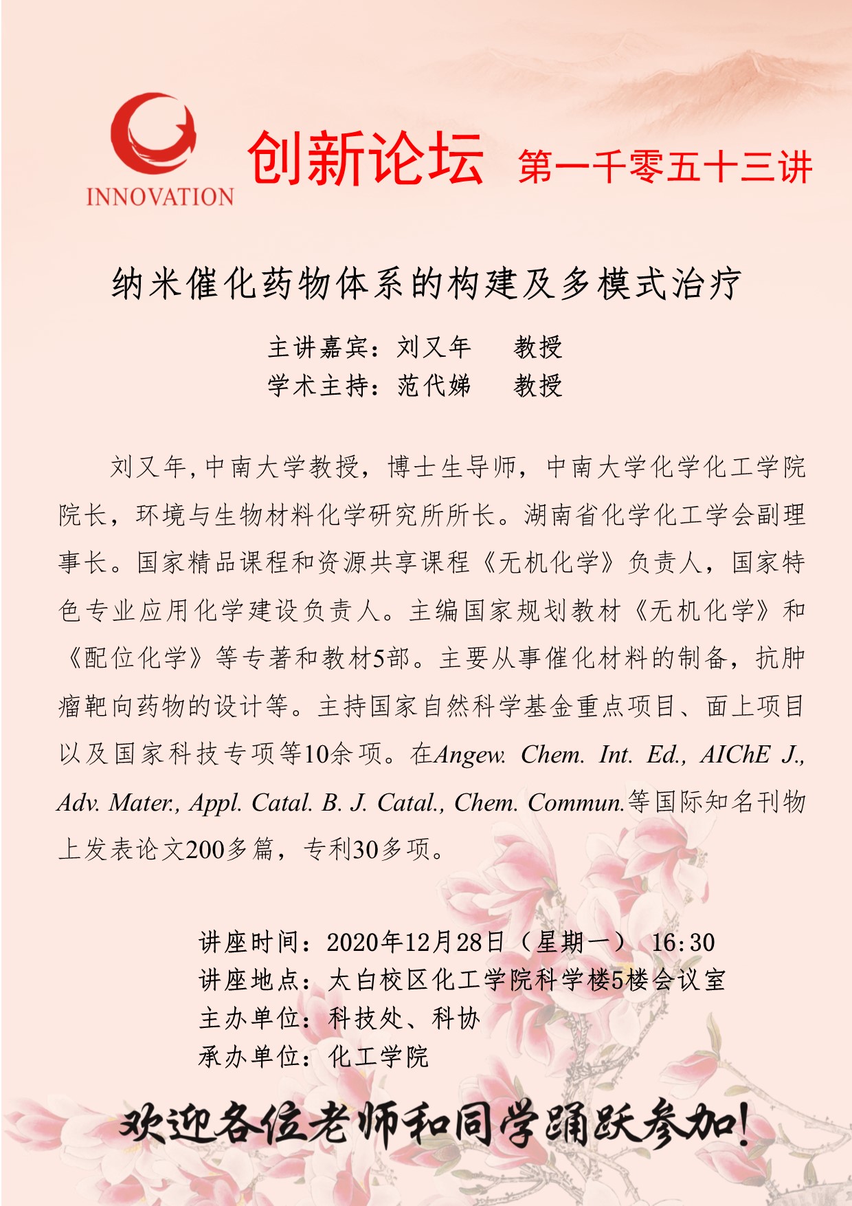 刘又年 教授 8868体育登录创新论坛第一千零五十三讲:纳米催化药物体系的构建及多模式治疗 讲座时间 2020年12月28日(星期一) 16:30 讲座地点 太白校区化工学院科学楼5楼会议室 讲座人介绍 刘又年 教授 讲座内容