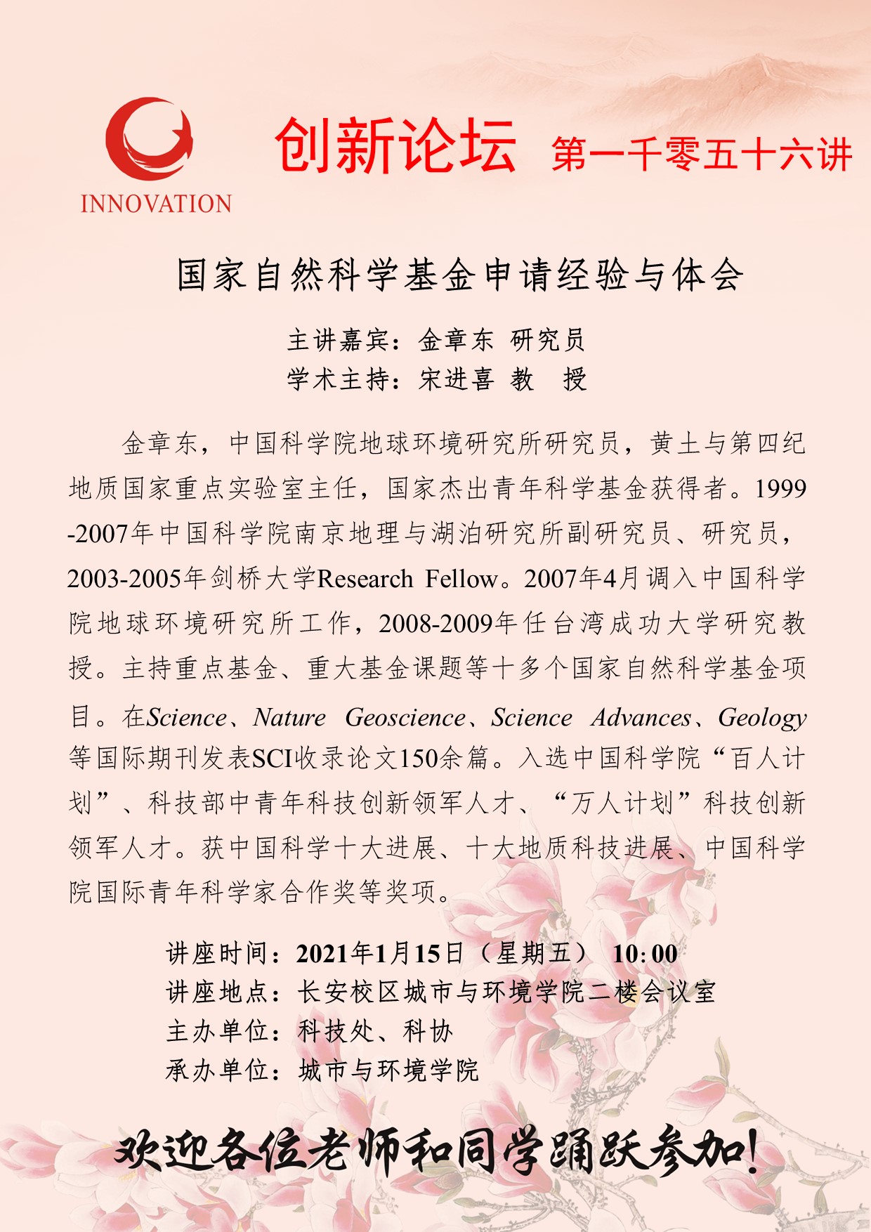金章东 研究员 8868体育登录创新论坛第一千零五十六讲:国家自然科学基金申请经验与体会 讲座时间 2021年1月15日(星期五) 10:00 讲座地点 长安校区城市与环境学院二楼会议室 讲座人介绍 金章东 研究员 讲座内容