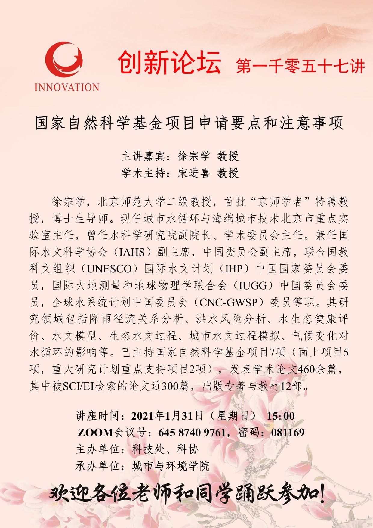 徐宗学 教授 8868体育登录创新论坛第一千零五十七讲:国家自然科学基金项目申请要点和注意事项 讲座时间 2021年1月31日(星期日) 15:00 讲座地点 ZOOM会议号:64587409761,密码:081169 讲座人介绍 徐宗学 教授 讲座内容