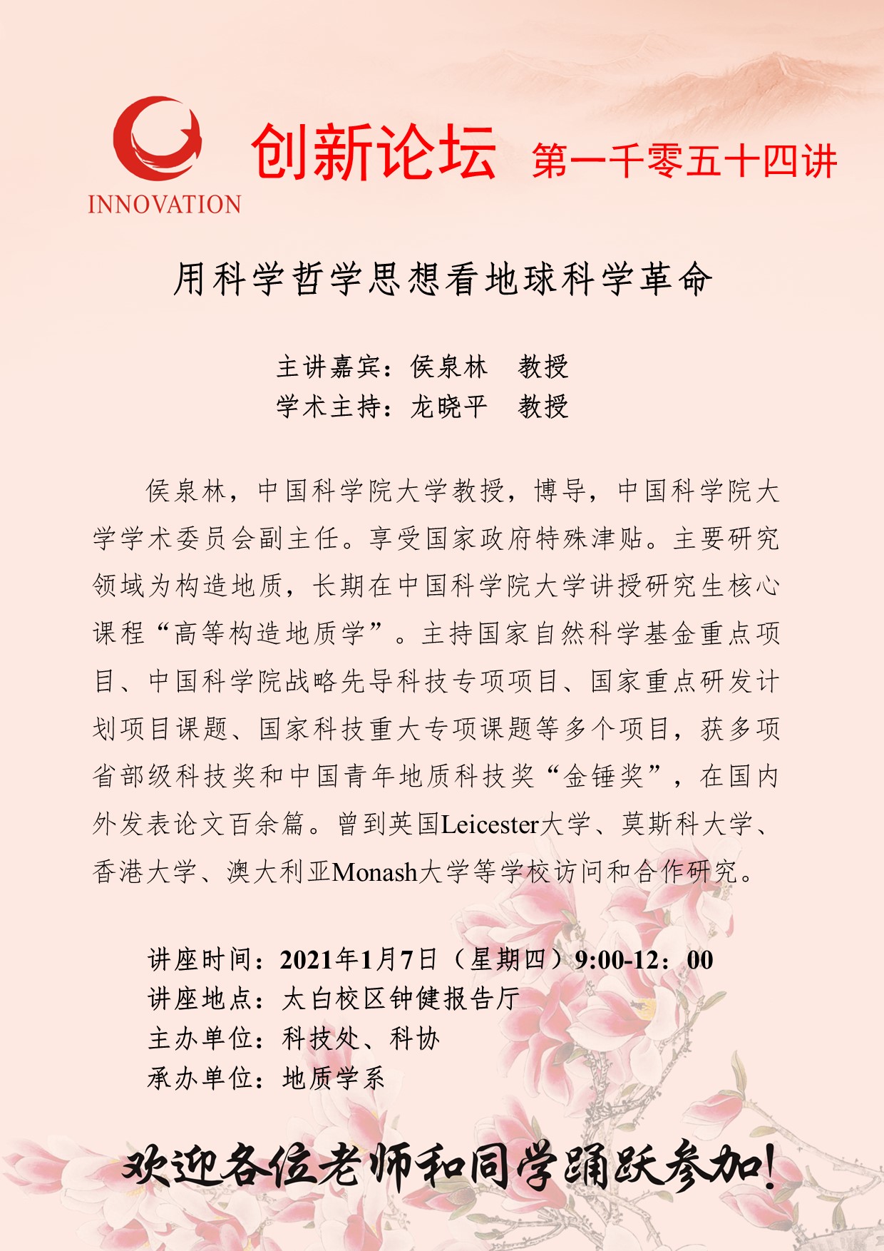 侯泉林 教授 8868体育登录创新论坛第一千零五十四讲:用科学哲学思想看地球科学革命 讲座时间 2021年1月7日(星期四) 9:00-12:00 讲座地点 太白校区钟健报告厅 讲座人介绍 侯泉林 教授 讲座内容