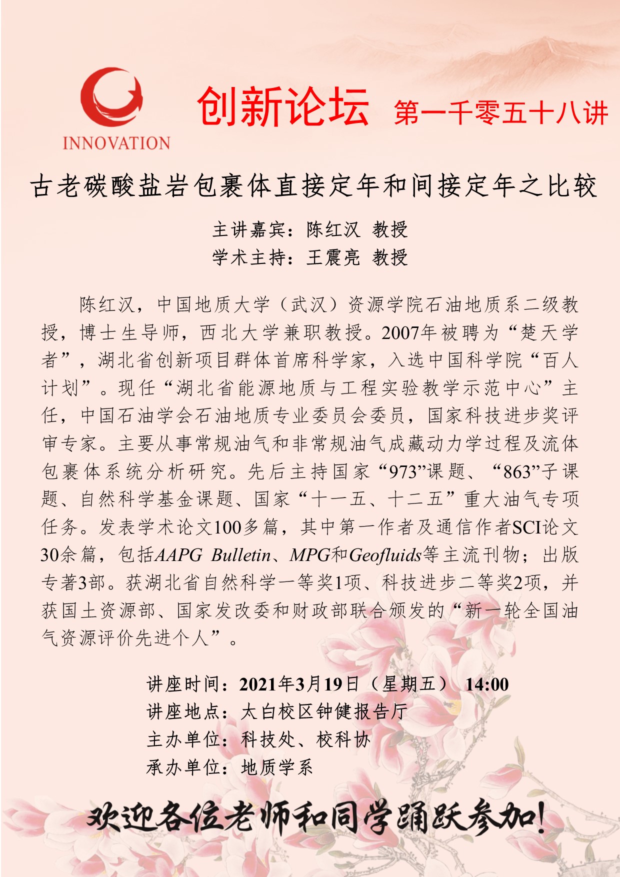 陈红汉 教授 8868体育登录创新论坛第一千零五十八讲:古老碳酸盐岩包裹体直接定年和间接定年之比较 讲座时间 2021年3月19日(星期五) 14:00 讲座地点 太白校区钟健报告厅 讲座人介绍 陈红汉 教授 讲座内容