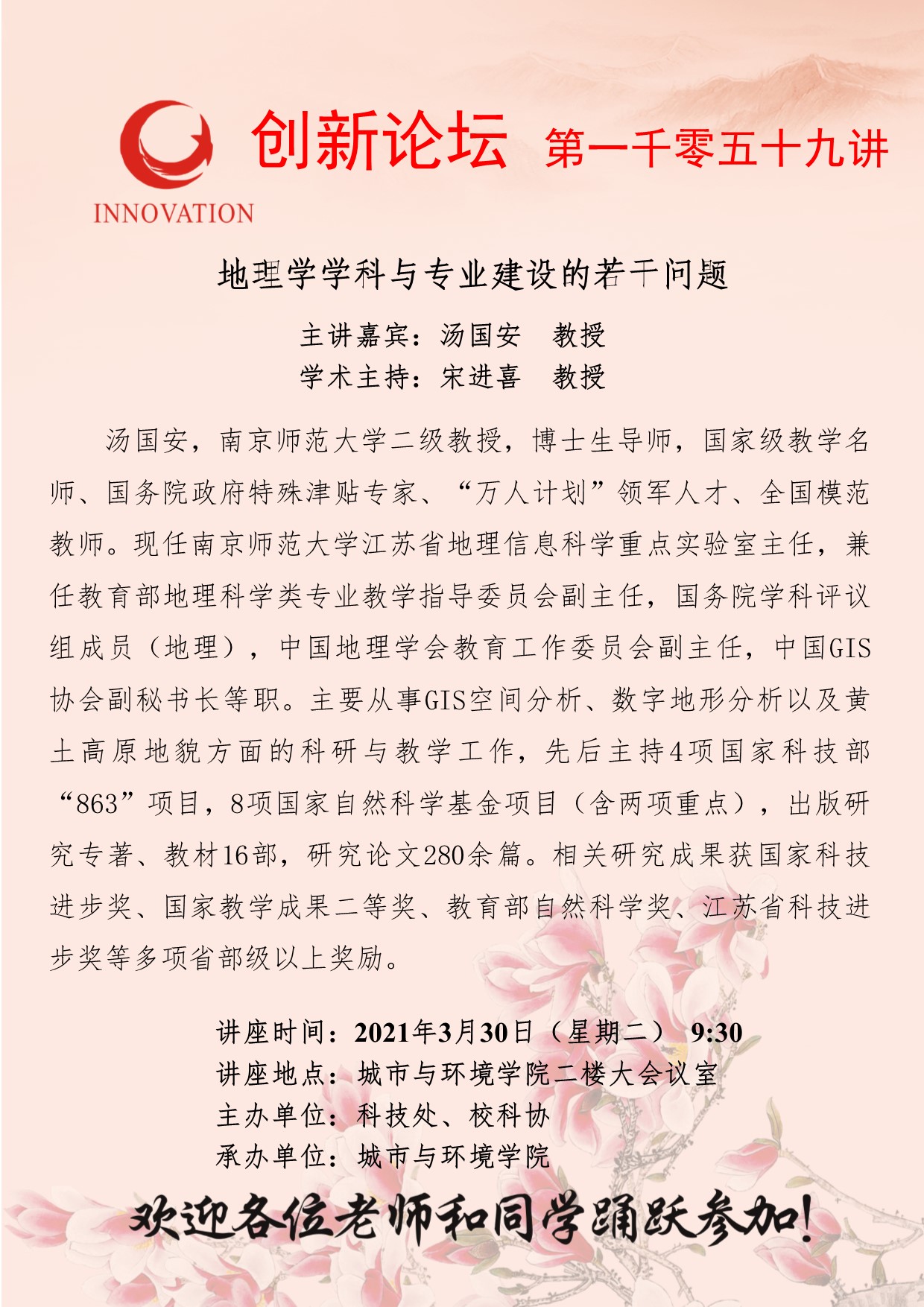 汤国安 教授 8868体育登录创新论坛第一千零五十九讲:地理学学科与专业建设的若干问题 讲座时间 2021年3月30日(星期二) 9:30 讲座地点 城市与环境学院二楼大会议室 讲座人介绍 汤国安 教授 讲座内容