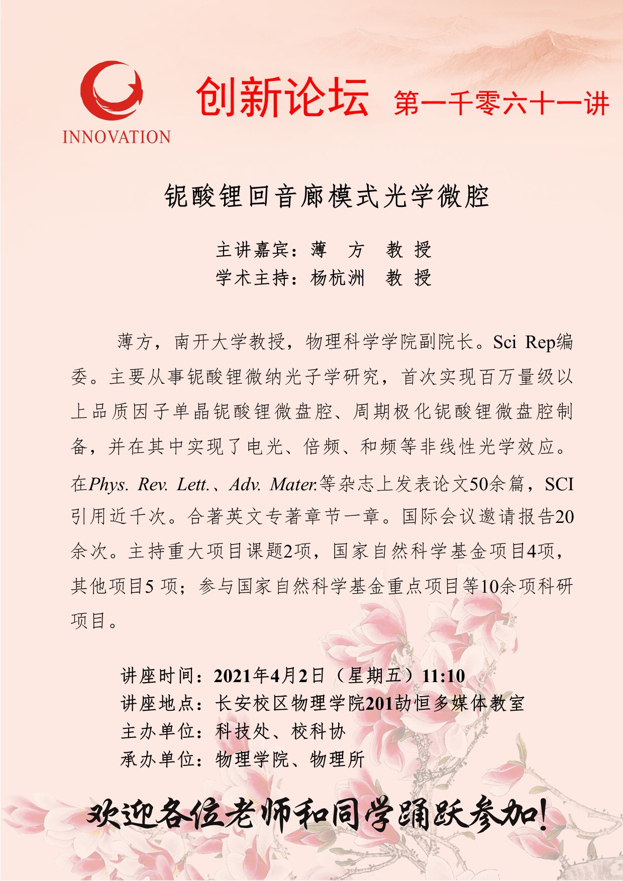 薄 方 教 授 8868体育登录创新论坛第一千零六十一讲:铌酸锂回音廊模式光学微腔 讲座时间 2021年4月2日(星期五)11:10 讲座地点 长安校区物理学院201劼恒多媒体教室 讲座人介绍 薄 方 教 授 讲座内容