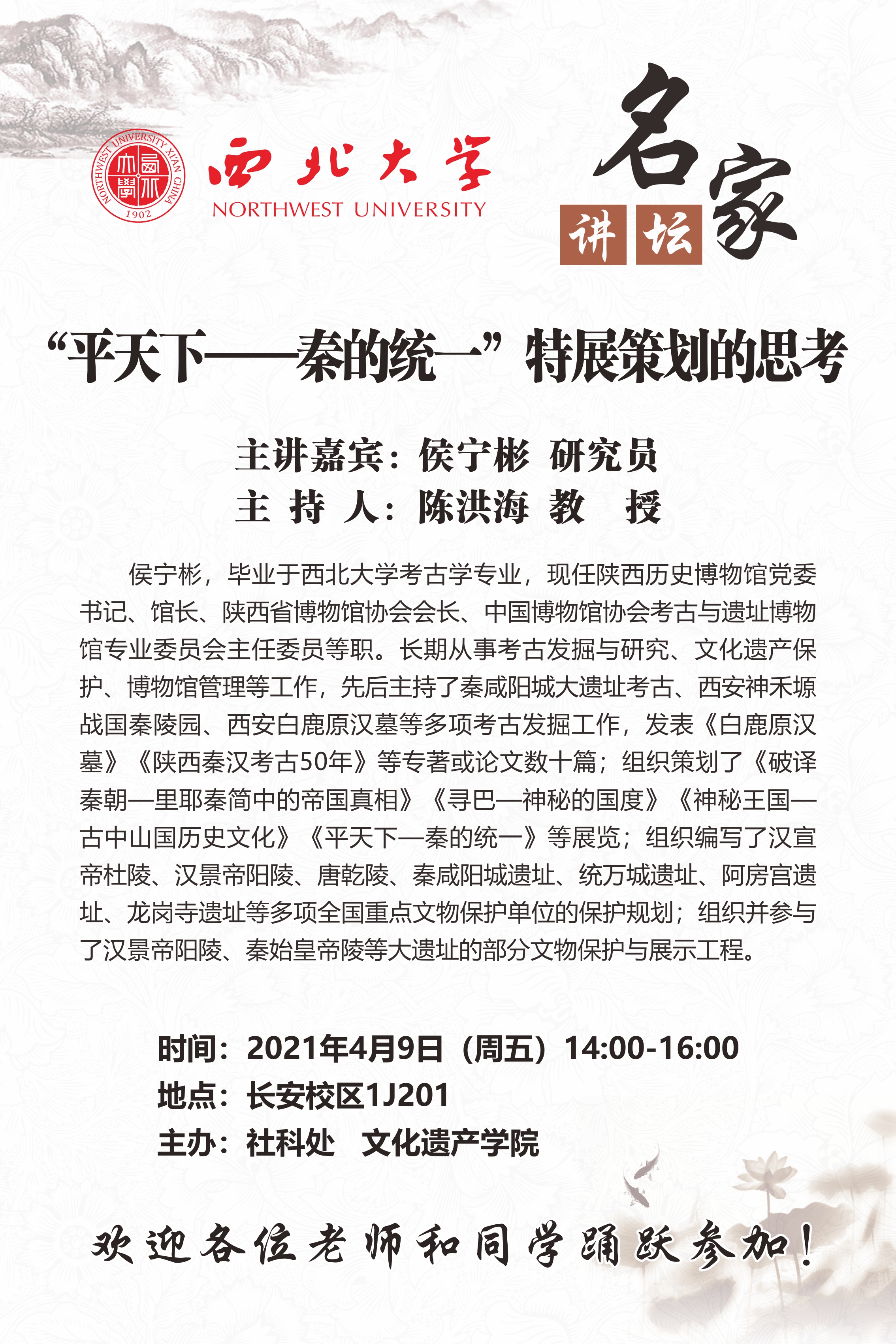 侯宁彬 研究员 名家讲坛:“平天下——秦的统一”特展策划的思考 讲座时间 2021年4月9日(周五)14:00-16:00 讲座地点 长安校区1号教学楼1J201教室 讲座人介绍 侯宁彬 研究员 讲座内容