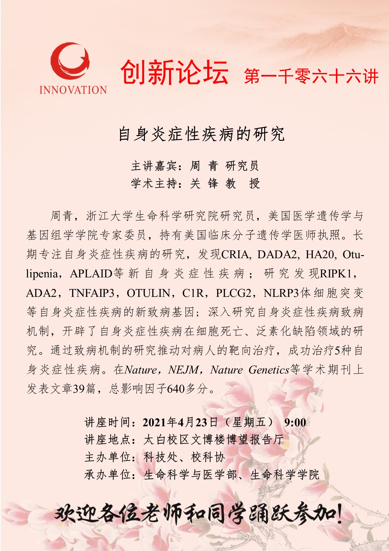 周 青 研究员 8868体育登录创新论坛第一千零六十六讲:自身炎症性疾病的研究 讲座时间 2021年4月23日(星期五) 9:00 讲座地点 太白校区文博楼博望报告厅 讲座人介绍 周 青 研究员 讲座内容