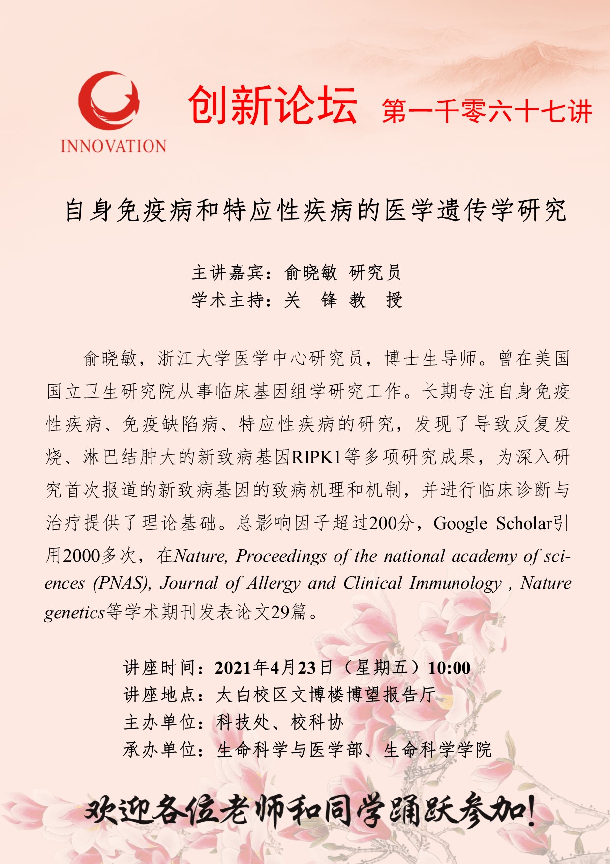 俞晓敏 研究员 8868体育登录创新论坛第一千零六十七讲:自身免疫病和特应性疾病的医学遗传学研究 讲座时间 2021年4月23日(星期五)10:00 讲座地点 太白校区文博楼博望报告厅 讲座人介绍 俞晓敏 研究员 讲座内容
