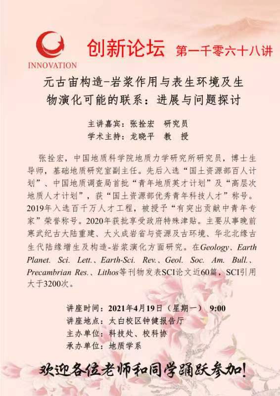 张拴宏 研究员 8868体育登录创新论坛第一千零六十八讲:元古宙构造-岩浆作用与表生环境及生物演化可能的联系:进展与问题探讨 讲座时间 2021年4月19日(星期一) 9:00 讲座地点 太白校区钟健报告厅 讲座人介绍 张拴宏 研究员 讲座内容