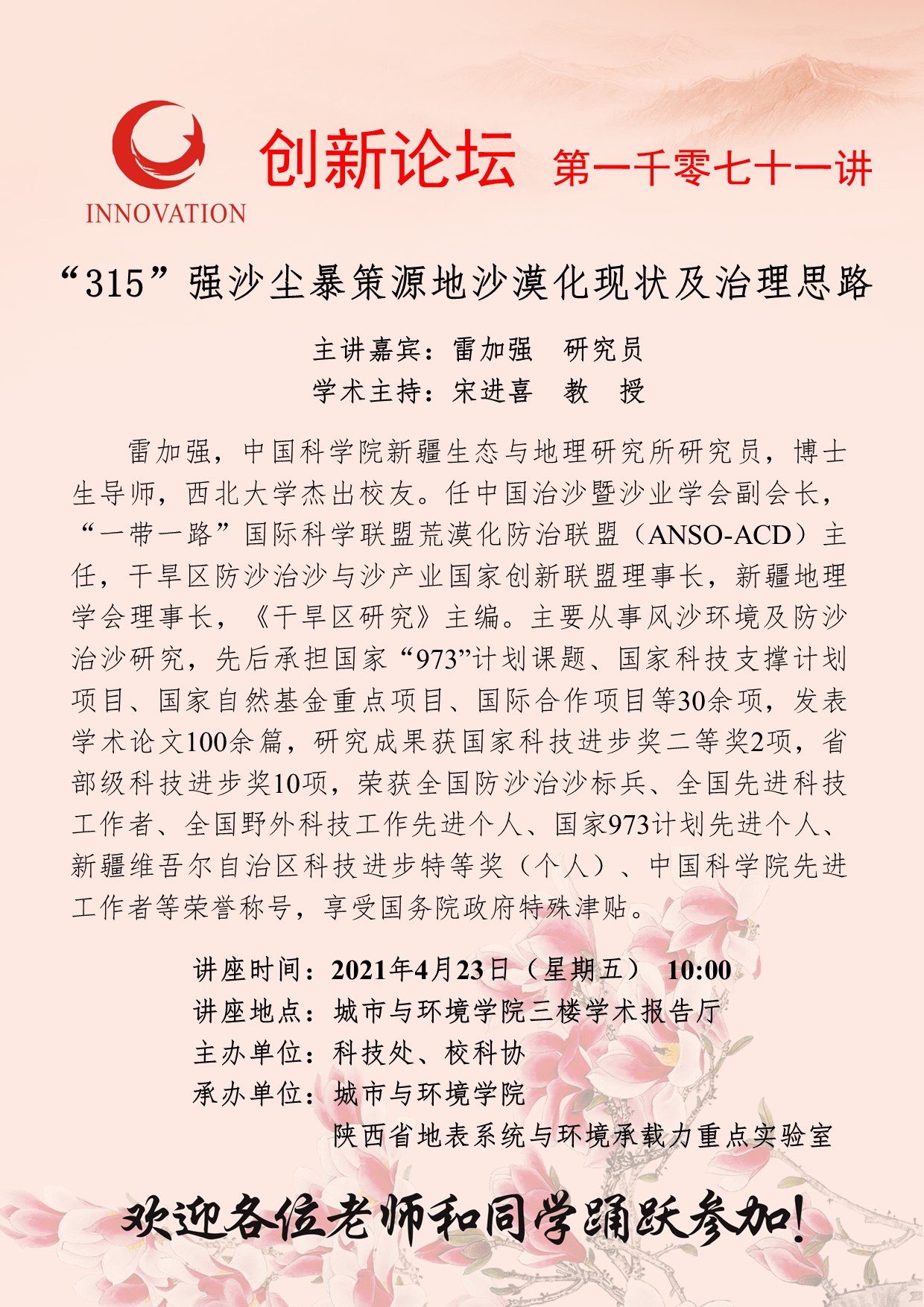 雷加强 研究员 8868体育登录创新论坛第一千零七十一讲:“315”强沙尘暴策源地沙漠化现状及治理思路 讲座时间 2021年4月23日(星期五) 10:00 讲座地点 城市与环境学院三楼学术报告厅 讲座人介绍 雷加强 研究员 讲座内容
