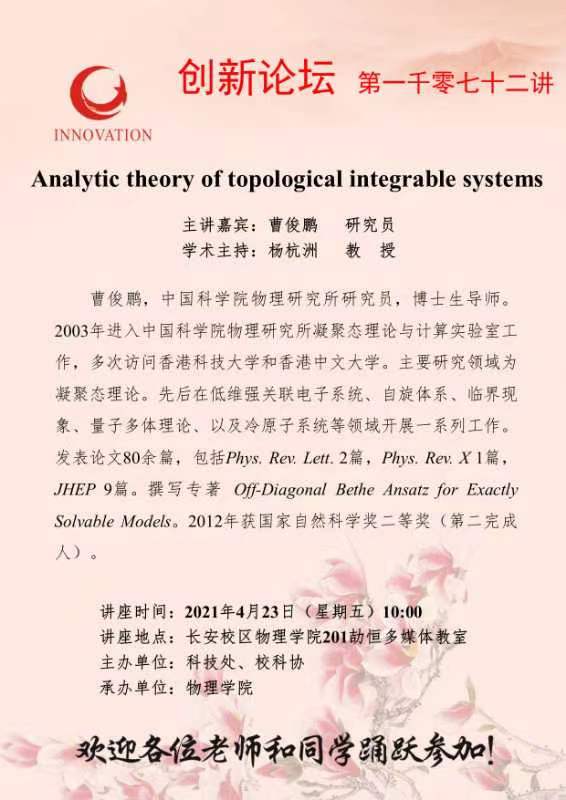 曹俊鹏 研究员 8868体育登录创新论坛第一千零七十二讲:Analytic theory of topological integrable systems 讲座时间 2021年4月23日(星期五)10:00 讲座地点 长安校区物理学院201劼恒多媒体教室 讲座人介绍 曹俊鹏 研究员 讲座内容