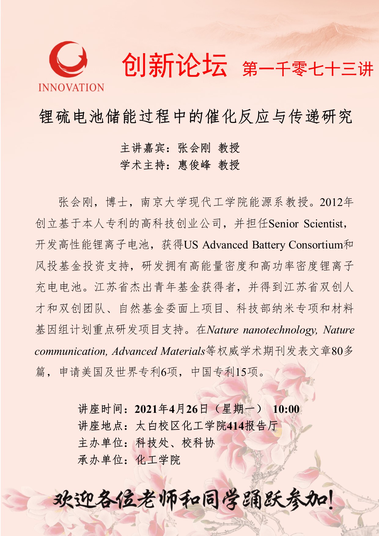 张会刚 教授 8868体育登录创新论坛第一千零七十三讲:锂硫电池储能过程中的催化反应与传递研究 讲座时间 2021年4月26日(星期一) 10:00 讲座地点 太白校区化工学院414报告厅 讲座人介绍 张会刚 教授 讲座内容