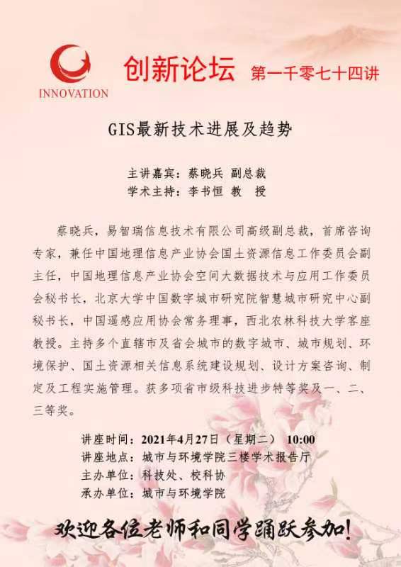蔡晓兵 副总裁 8868体育登录创新论坛第一千零七十四讲:GIS最新技术进展及趋势 讲座时间 2021年4月27日(星期二) 10:00 讲座地点 城市与环境学院三楼学术报告厅 讲座人介绍 蔡晓兵 副总裁 讲座内容