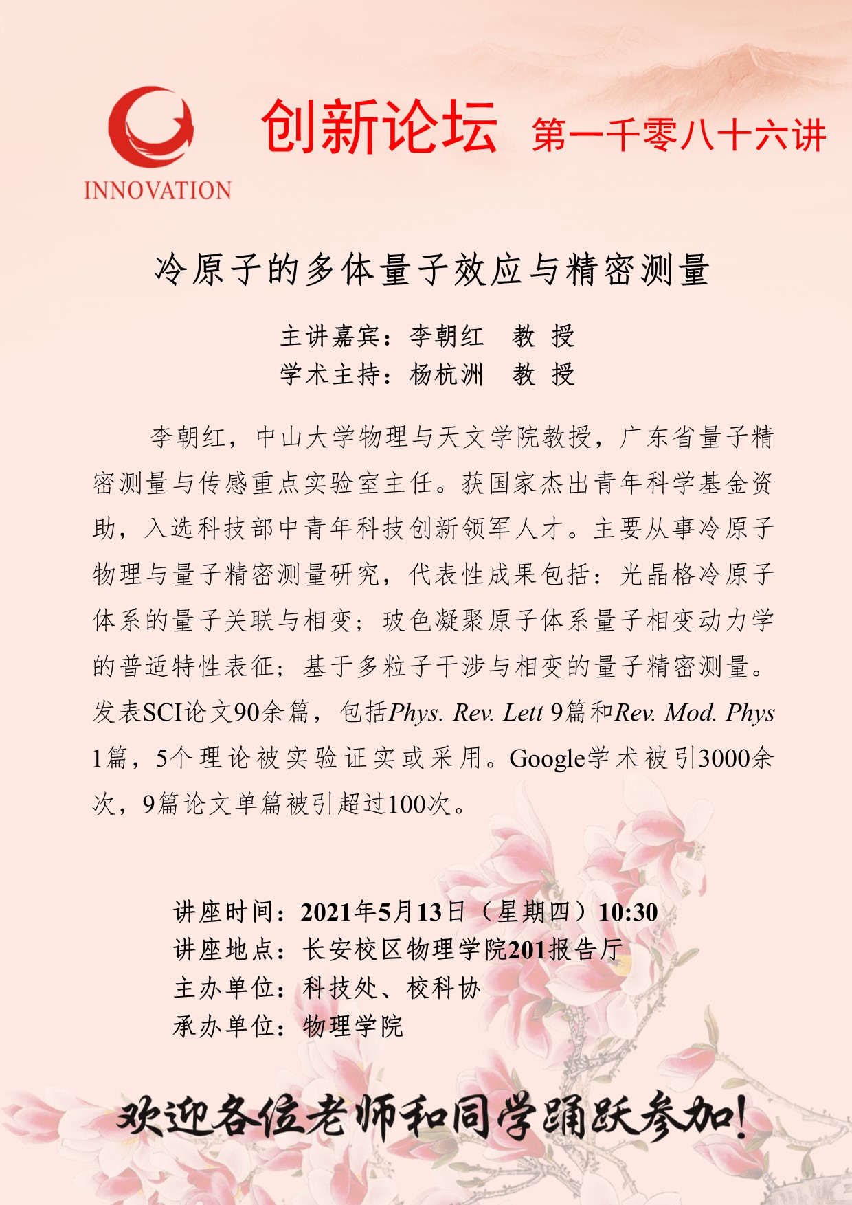 李朝红 教 授 8868体育登录创新论坛第一千零八十六讲:冷原子的多体量子效应与精密测量 讲座时间 2021年5月13日(星期四)10:30 讲座地点 长安校区物理学院201报告厅 讲座人介绍 李朝红 教 授 讲座内容