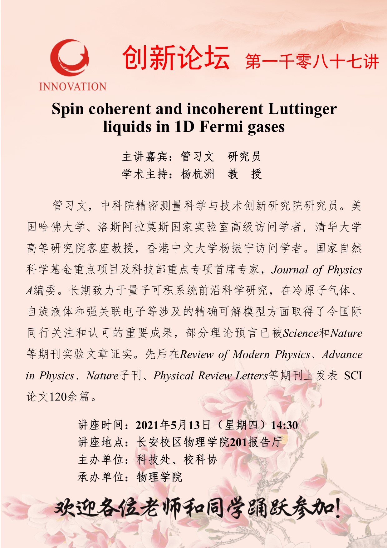 管习文 研究员 8868体育登录创新论坛第一千零八十七讲:Spin coherent and incoherent Luttinger liquids in 1D Fermi gases 讲座时间 2021年5月13日(星期四)14:30 讲座地点 长安校区物理学院201报告厅 讲座人介绍 管习文 研究员 讲座内容