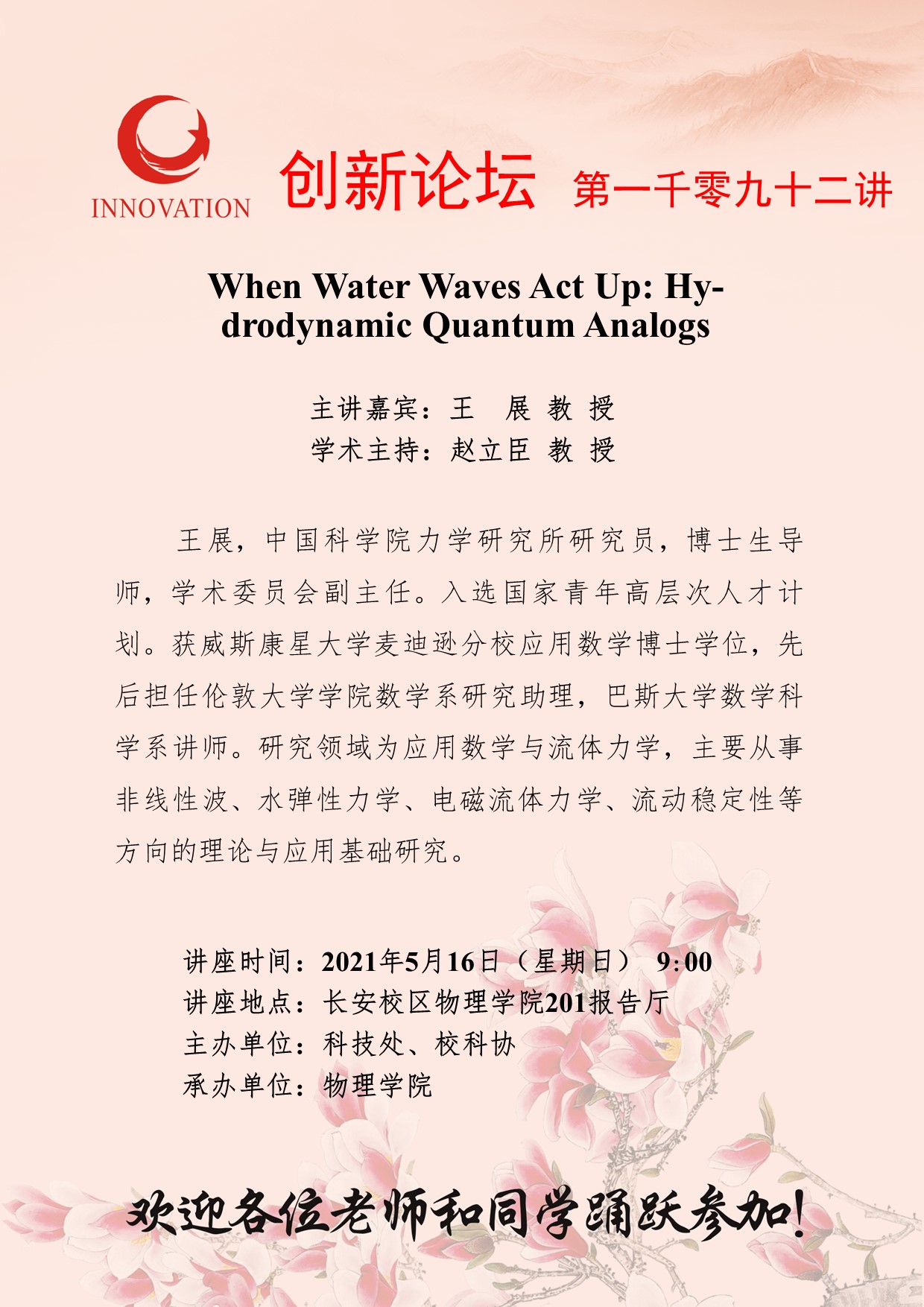 王 展 教 授 8868体育登录创新论坛第一千零九十二讲:When Water Waves Act Up: Hydrodynamic Quantum Analogs 讲座时间 2021年5月16日(星期日) 9:00 讲座地点 长安校区物理学院201报告厅 讲座人介绍 王 展 教 授 讲座内容
