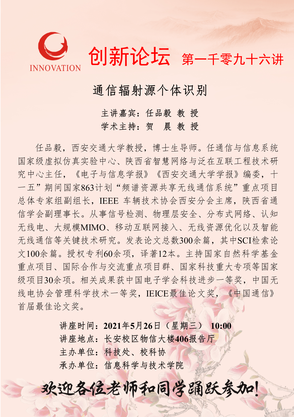 任品毅 教 授 8868体育登录创新论坛第一千零九十六讲:通信辐射源个体识别 讲座时间 2021年5月26日(星期三) 10:00 讲座地点 长安校区物信大楼406报告厅 讲座人介绍 任品毅 教 授 讲座内容