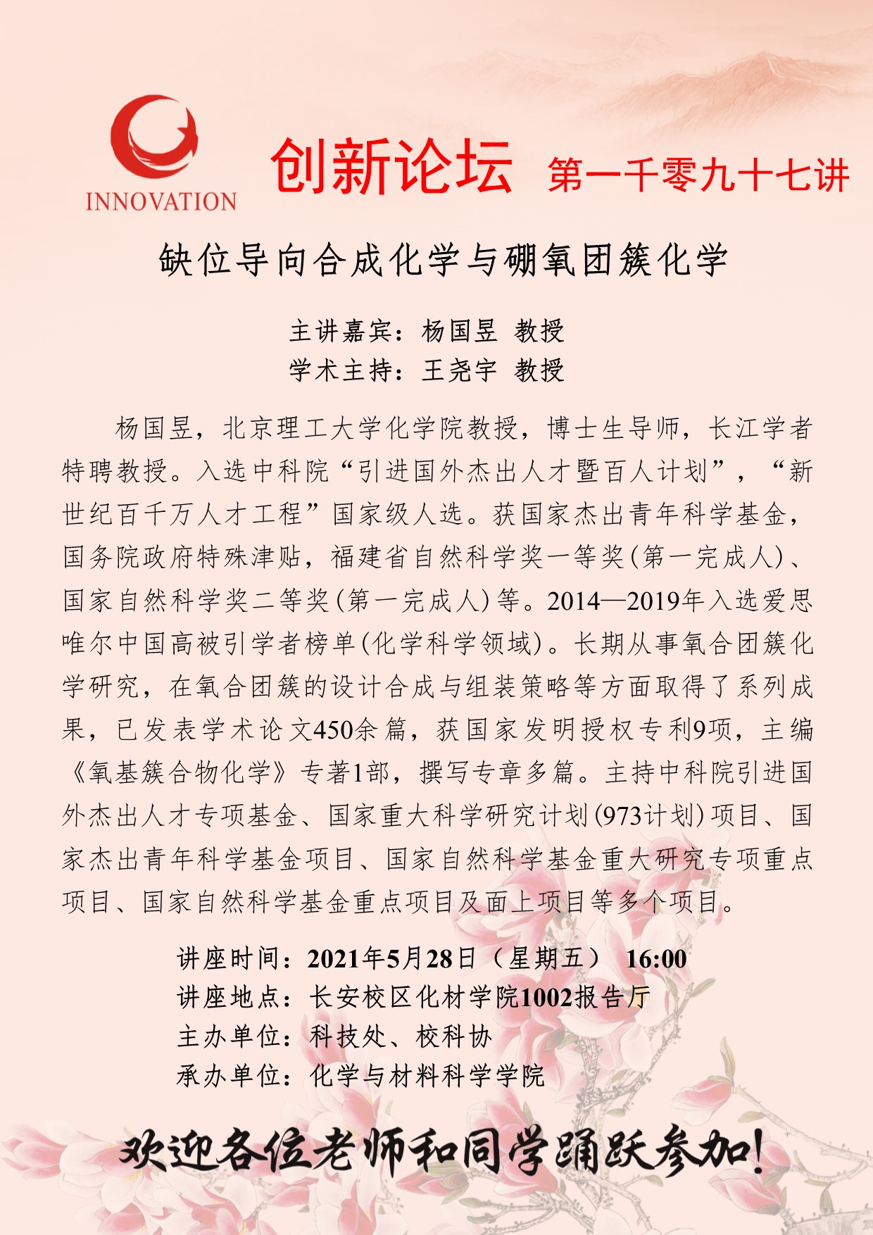 杨国昱 教授 8868体育登录创新论坛第一千零九十七讲:缺位导向合成化学与硼氧团簇化学 讲座时间 2021年5月28日(星期五) 16:00 讲座地点 长安校区化材学院1002报告厅 讲座人介绍 杨国昱 教授 讲座内容