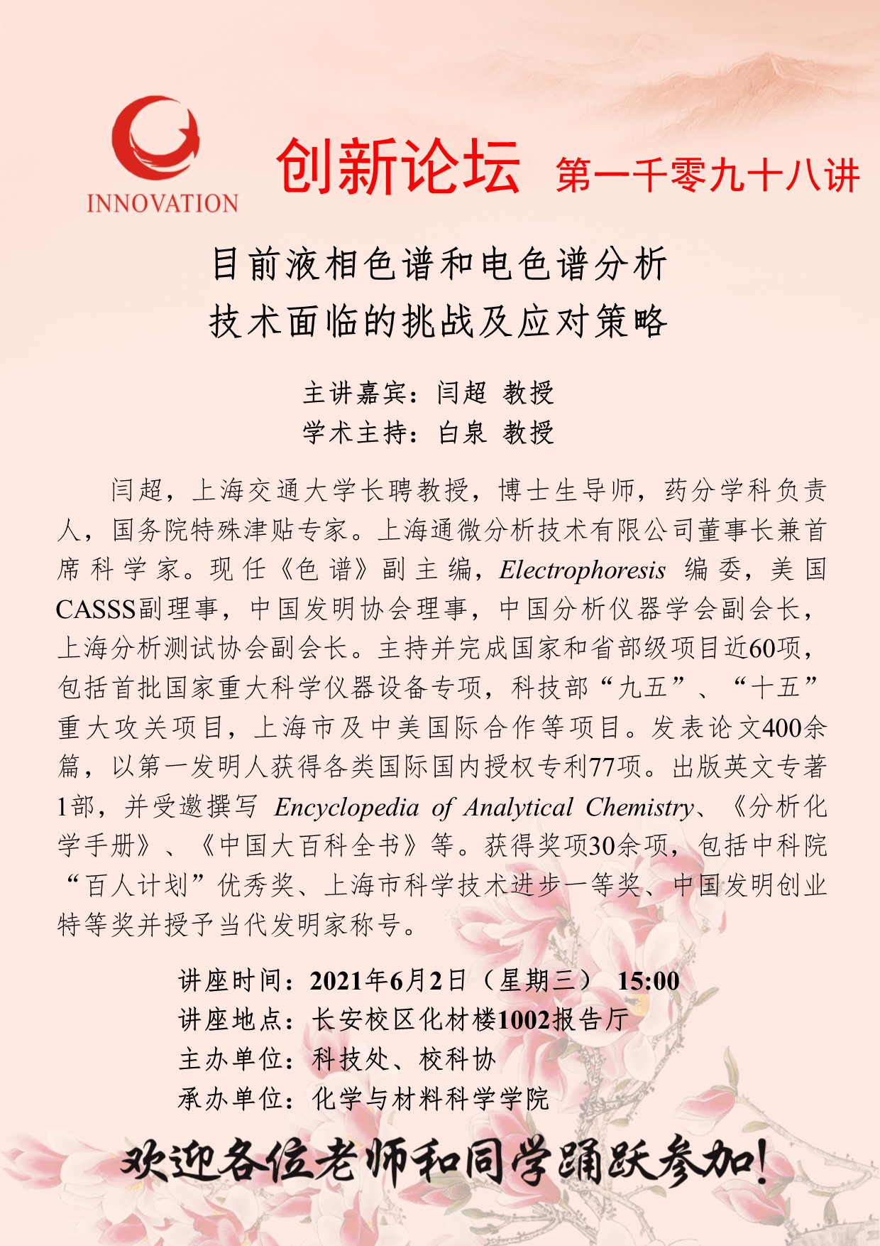 闫超 教授 8868体育登录创新论坛第一千零九十八讲:目前液相色谱和电色谱分析技术面临的挑战及应对策略 讲座时间 2021年6月2日(星期三) 15:00 讲座地点 长安校区化材楼1002报告厅 讲座人介绍 闫超 教授 讲座内容
