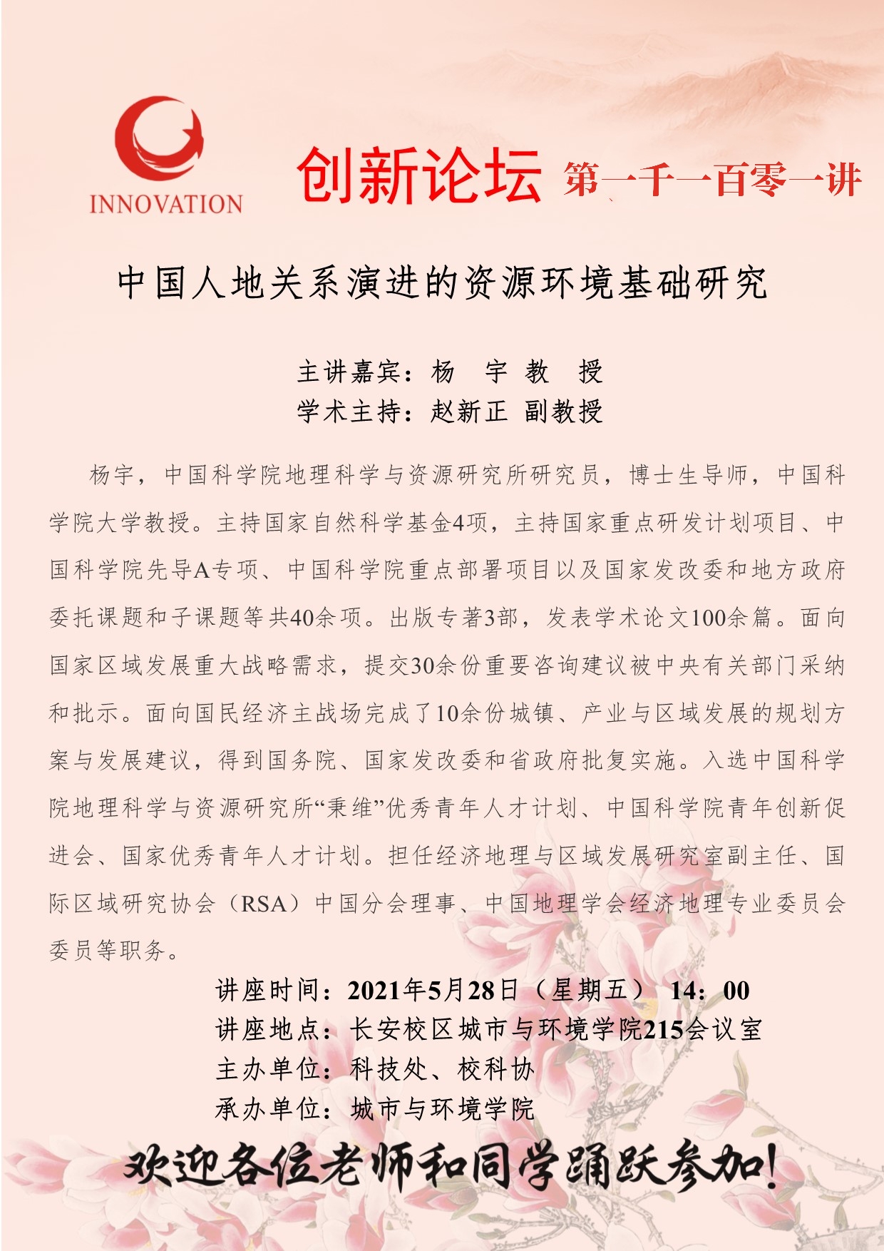 杨宇 教授 8868体育登录创新论坛第一千一百零一讲:中国人地关系演进的资源环境基础研究 讲座时间 2021年5月28日(星期五)14:00 讲座地点 长安校区城市与环境学院215会议室 讲座人介绍 杨宇 教授 讲座内容