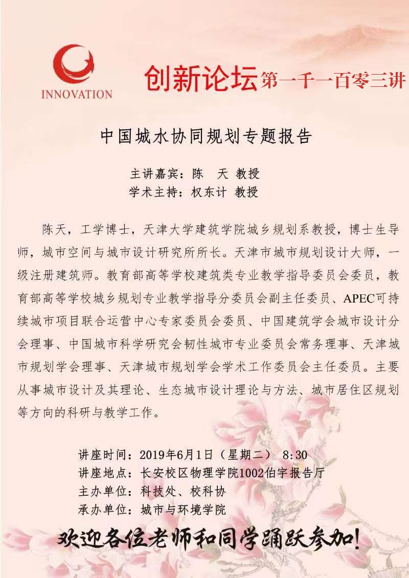 陈天 教授 8868体育登录创新论坛第一千一百零三讲:中国城水协同规划专题报告 讲座时间 2021年6月1日(星期二)8:30 讲座地点 长安校区物理学院1002伯宇报告厅 讲座人介绍 陈天 教授 讲座内容