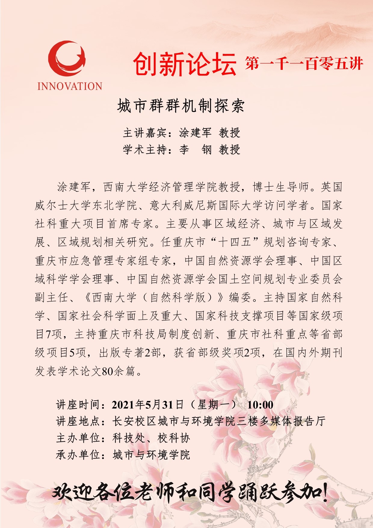 涂建军 教授 8868体育登录创新论坛第一千一百零五讲:城市群群机制探索 讲座时间 2021年5月31日(星期一) 10:00 讲座地点 长安校区城市与环境学院三楼多媒体报告厅 讲座人介绍 涂建军 教授 讲座内容