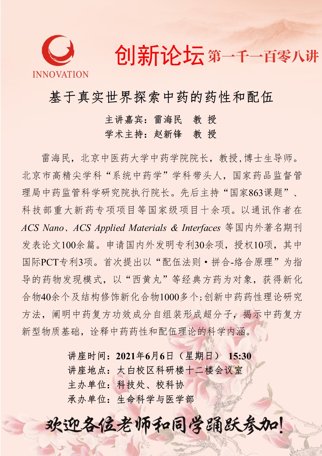 雷海民 教 授 8868体育登录创新论坛第一千一百零八讲:基于真实世界探索中药的药性和配伍 讲座时间 2021年6月6日(星期日) 15:30 讲座地点 太白校区科研楼十二楼会议室 讲座人介绍 雷海民 教 授 讲座内容