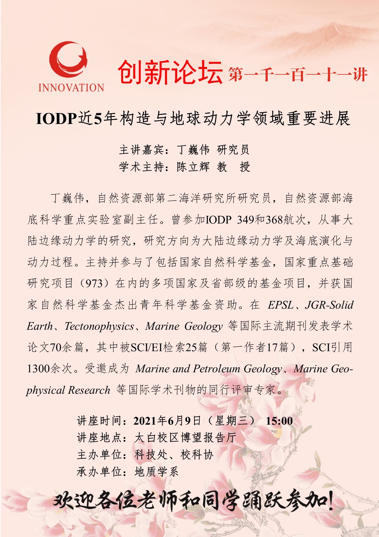 丁巍伟 研究员 8868体育登录创新论坛第一千一百一十一讲:IODP近5年构造与地球动力学领域重要进展 讲座时间 2021年6月9日(星期三) 15:00 讲座地点 太白校区博望报告厅 讲座人介绍 丁巍伟 研究员 讲座内容